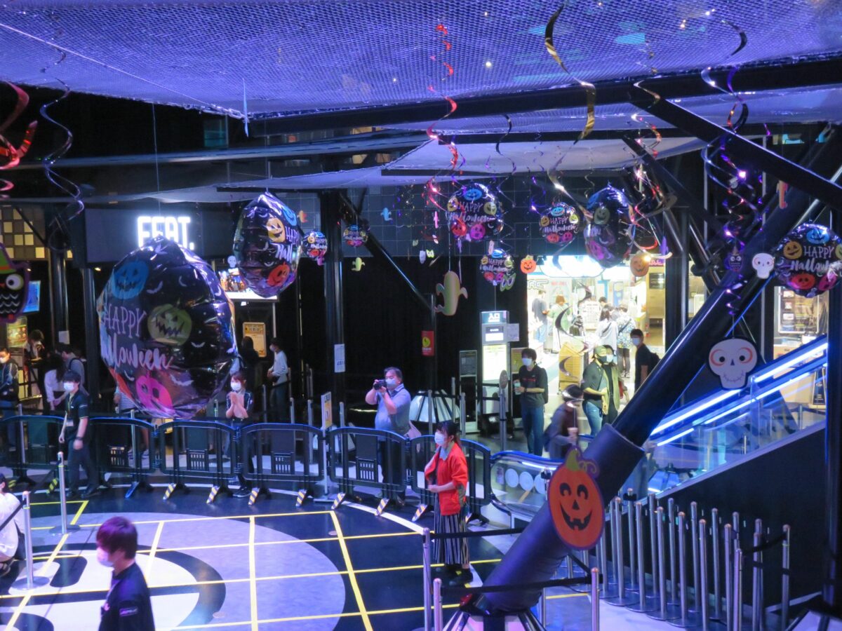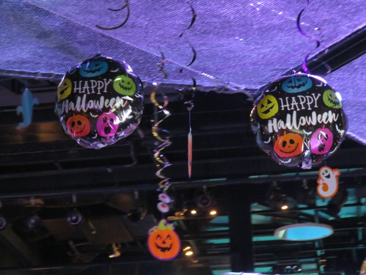 スマホでの撮影用のフォトフレームも設置され、天井はハロウィンのムードを盛り上げる風船が埋め尽くしています。