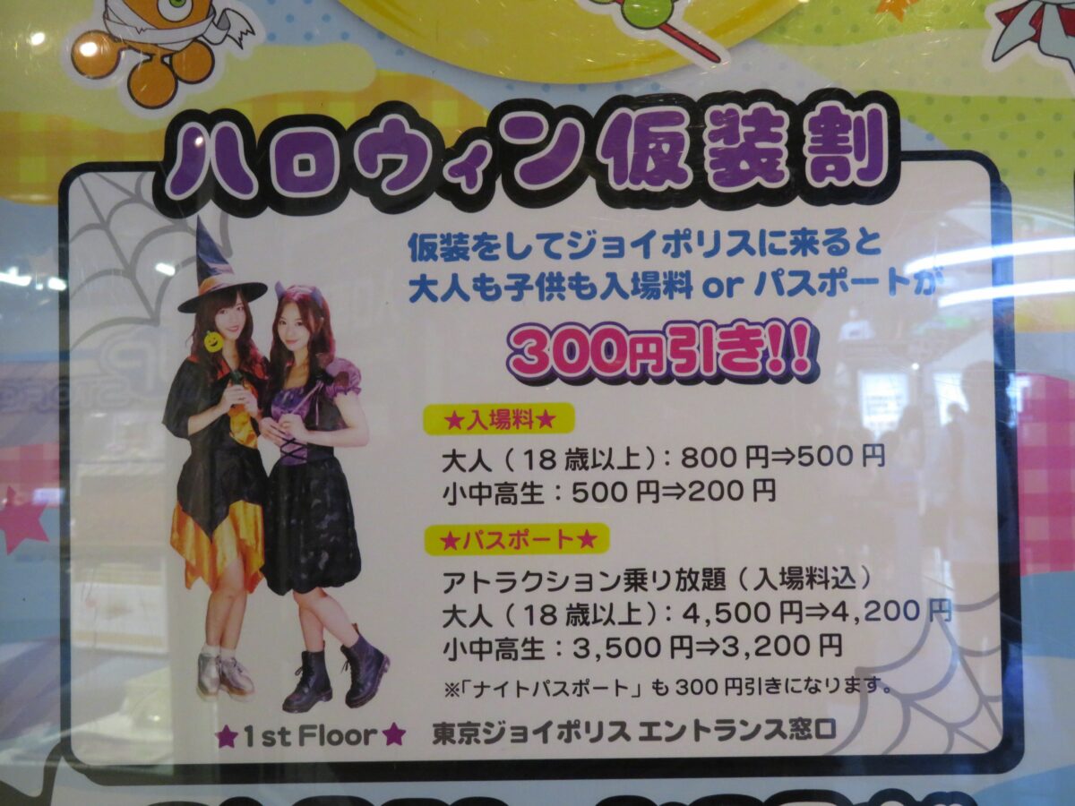 「東京ジョイポリス」の「カラフルハロウィンパーティ」期間中の仮装割の案内