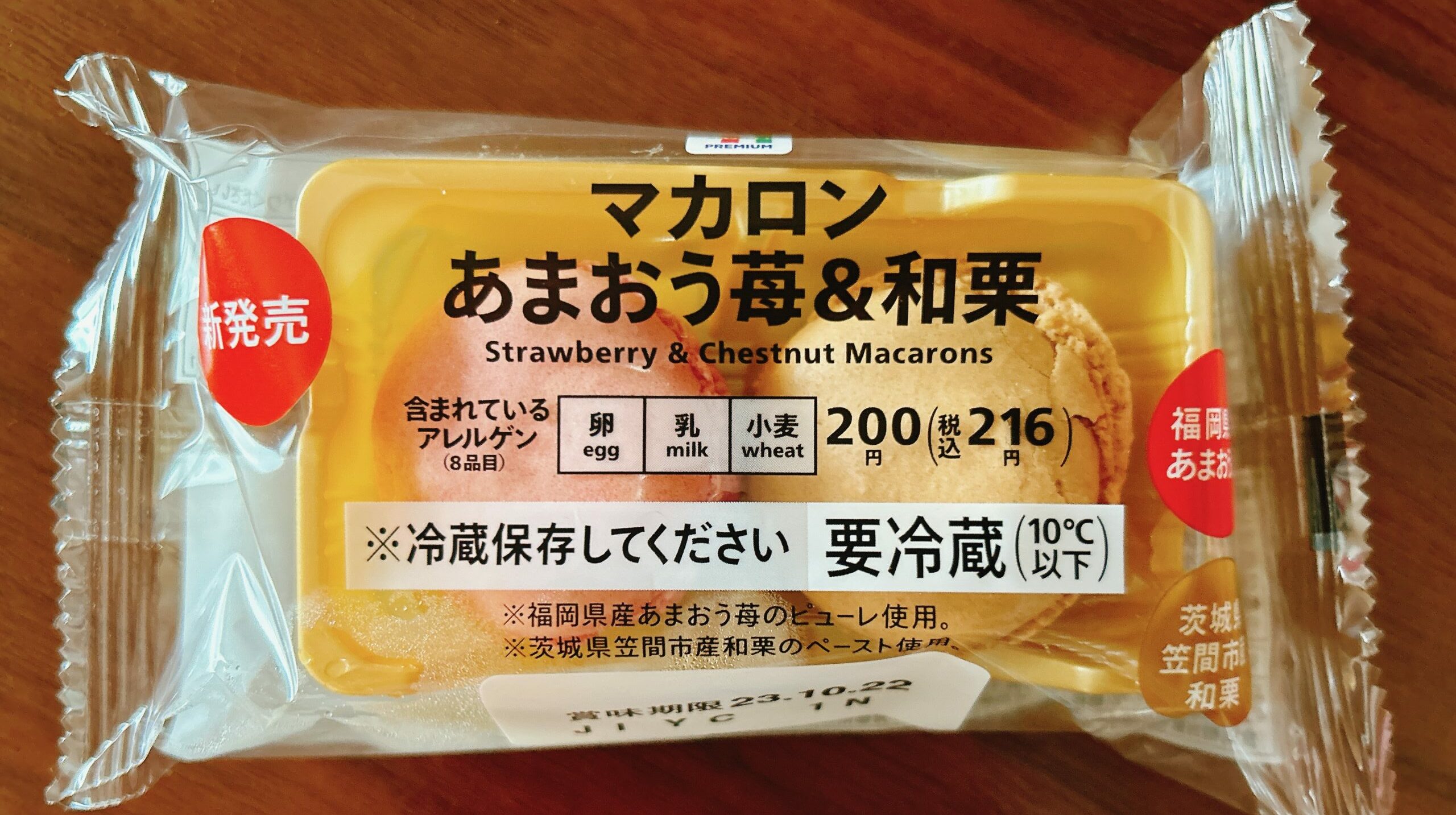 初めにご紹介するのは「マカロン あまおう苺&和栗」(税込216円)。一粒300円越えが当たり前のマカロンが、2つで216円はとってもリーズナブル!