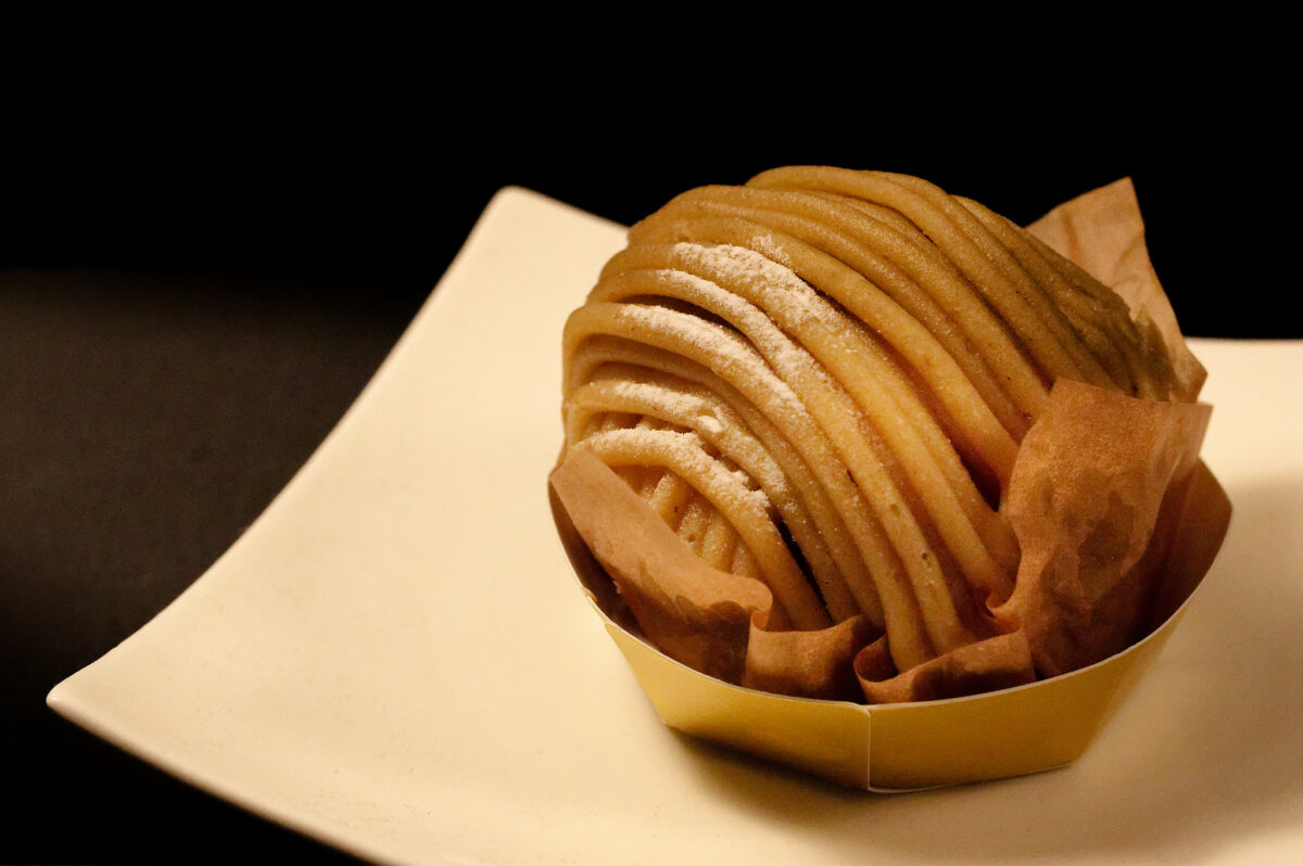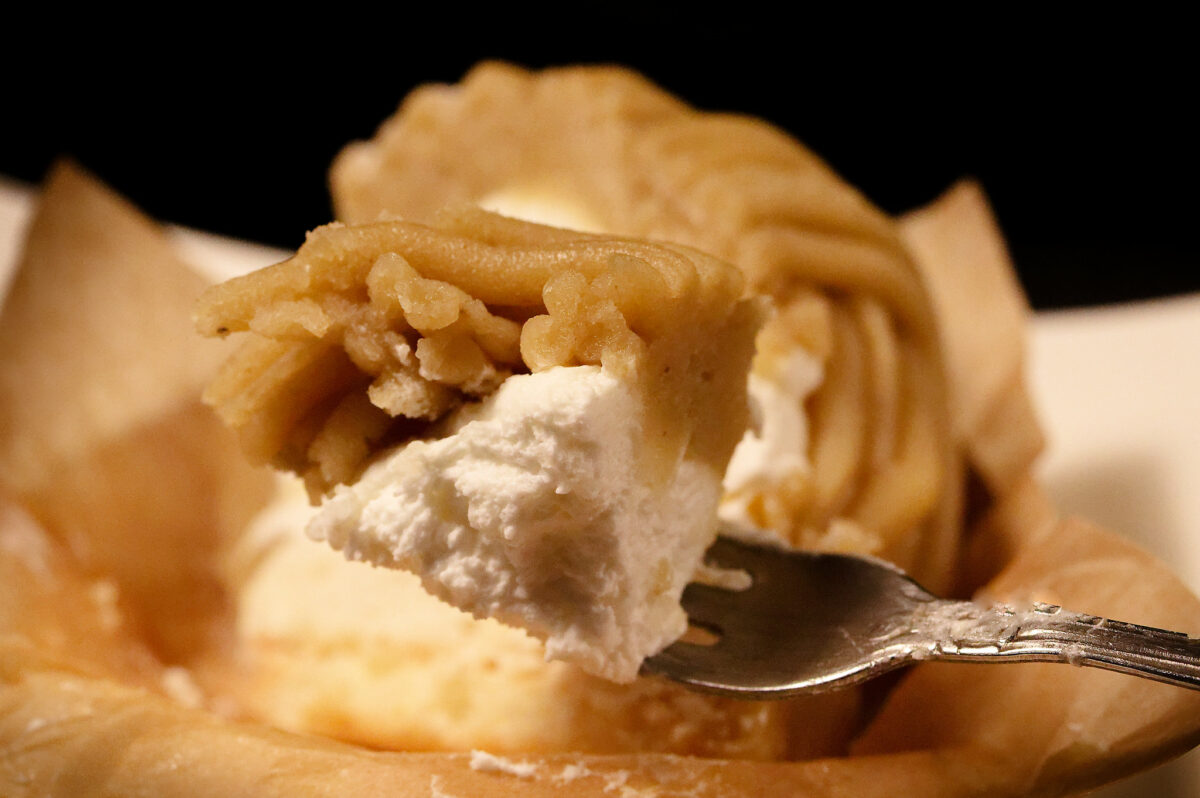 筆者がモンブランと聞いて思い浮かぶのは、黄色い栗のペーストが麺状に絞り出され、その頂きにホイップクリームと栗の甘露煮が載せられたケーキ。しかし、こちらのモンブランは渋めの褐色をしたペーストを使用しており、ほんのりと振りかけられた白い粉砂糖は初雪を連想します。どことなく大人の趣が漂う作りとなっています。