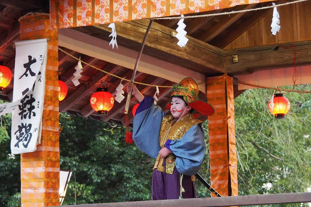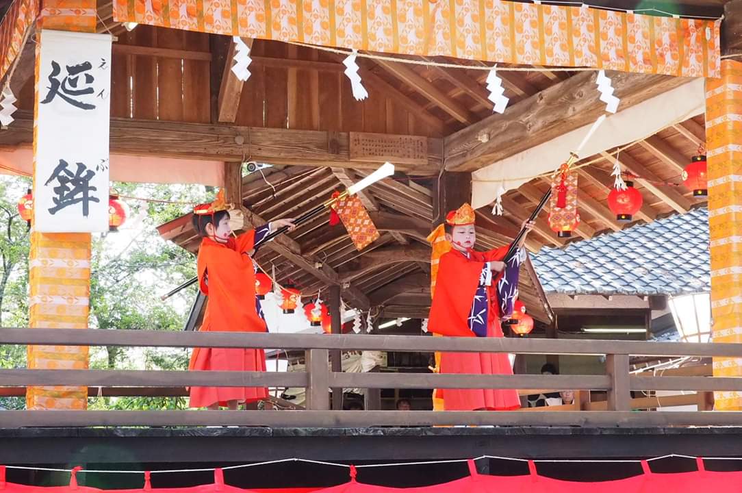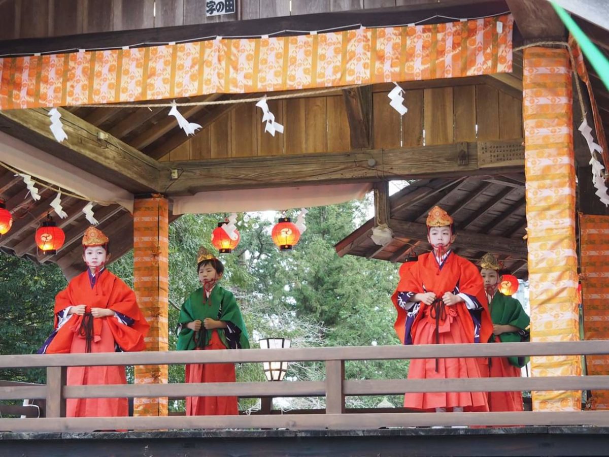 十二段の舞は六段ずつ子ども舞と大人舞で構成され、2日間に渡り行われます。両日ともに午後3時半から拝殿向かいの舞殿で奉納されます。