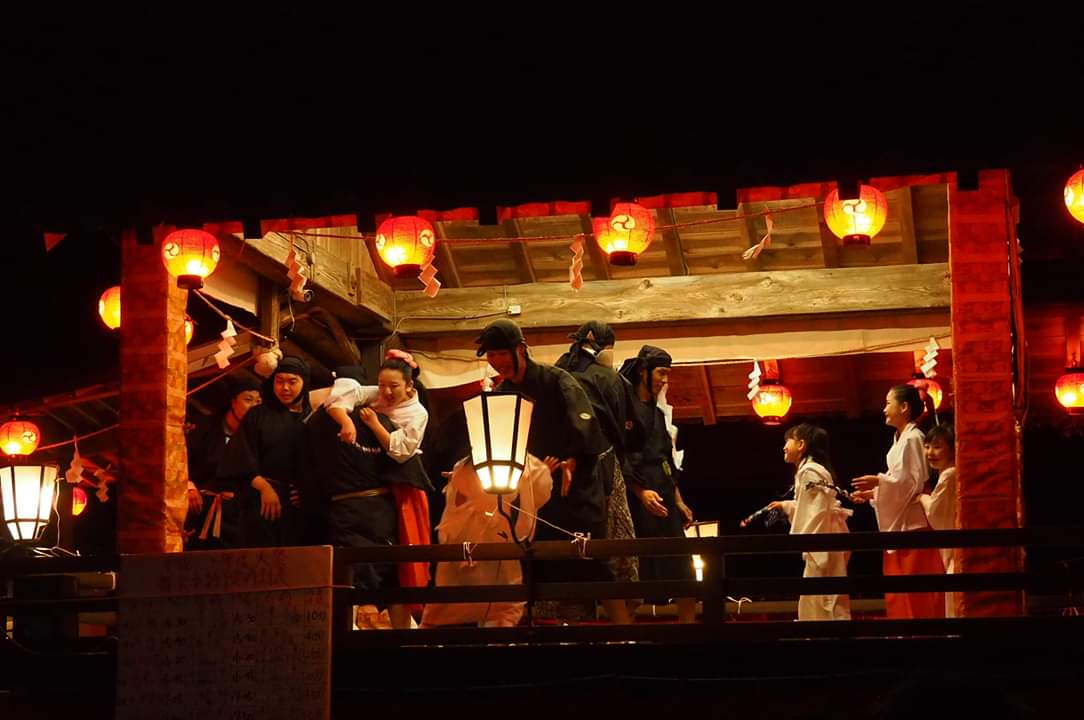 日曜には舞の途中から酒樽を担いだ酔っぱらいの男と黒紋付きを着た男が登場し、さらってしまいます。すると白衣姿に着替え、手拭いを絞りこんで作ったムチを手にした他の舞子たちが舞殿に登場し、男たちと争い大騒ぎをします。