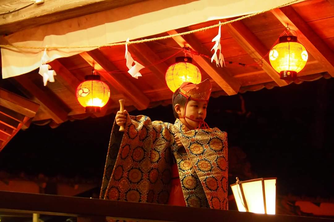 稚児の男児が鉾を手に天地・八方・舞台を祓い清め舞楽の開始を告げます。