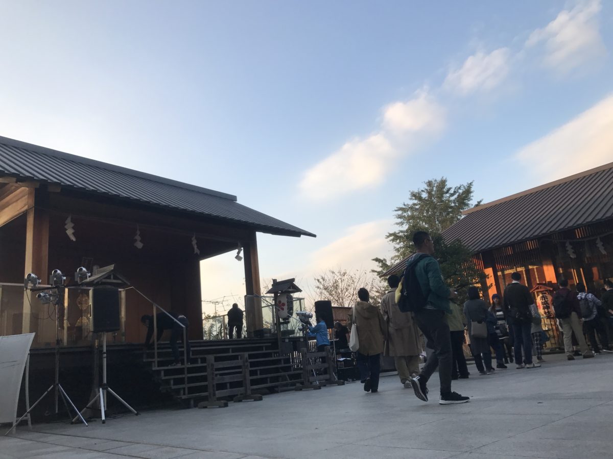 11月の風が肌寒くなってきたころ、紅葉と夕日に美しく照らされる赤城神社ではライブが始まります。モダンで美しい神楽殿で披露される、江戸御神楽、吟詠、長唄三味線、邦楽囃子。フィナーレは出演者も観客も一体となって盛り上がります。