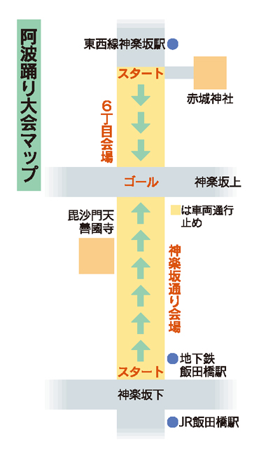 神楽坂阿波踊りのルートは、毘沙門天を中心として、飯田橋駅周辺と、神楽坂駅の2か所からスタート。何で2方向からスタート?それは・・・・。