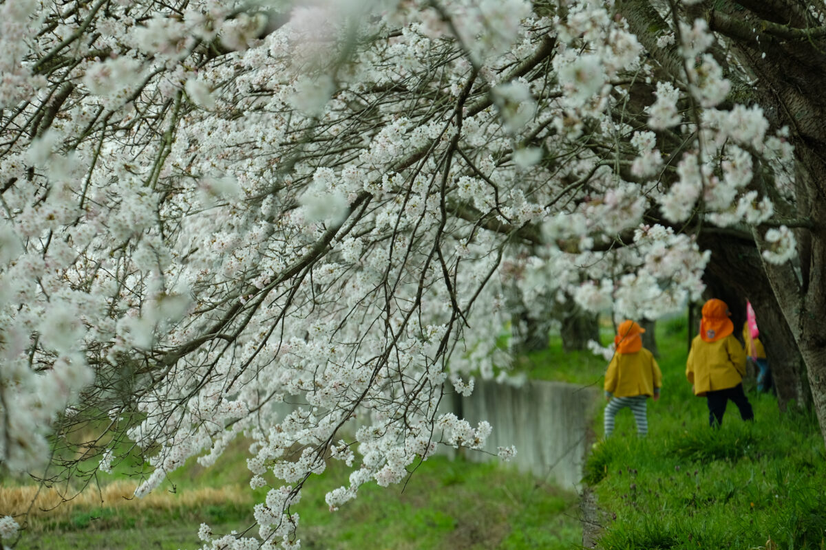 桜堤では近くの幼稚園の園児たちがクラスごとに集まって桜並木の下で遊んでいます。