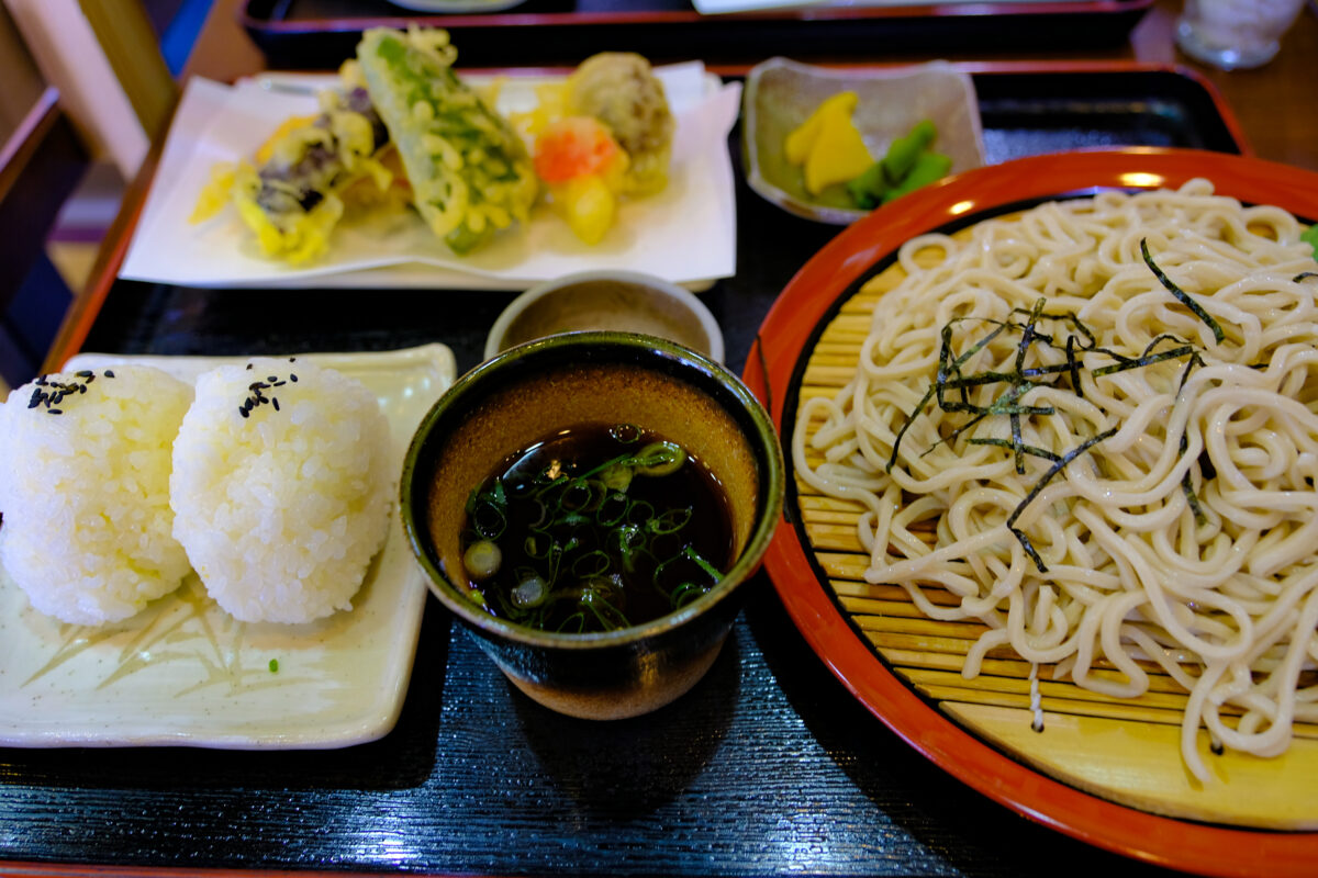 地元の食材をつかった手打ちの二八そばに、地元で取れた野菜のてんぷらと丹波産のお米を使った手作りおにぎりがつきます。人気№1だけあってとても美味しくお腹一杯になりました。