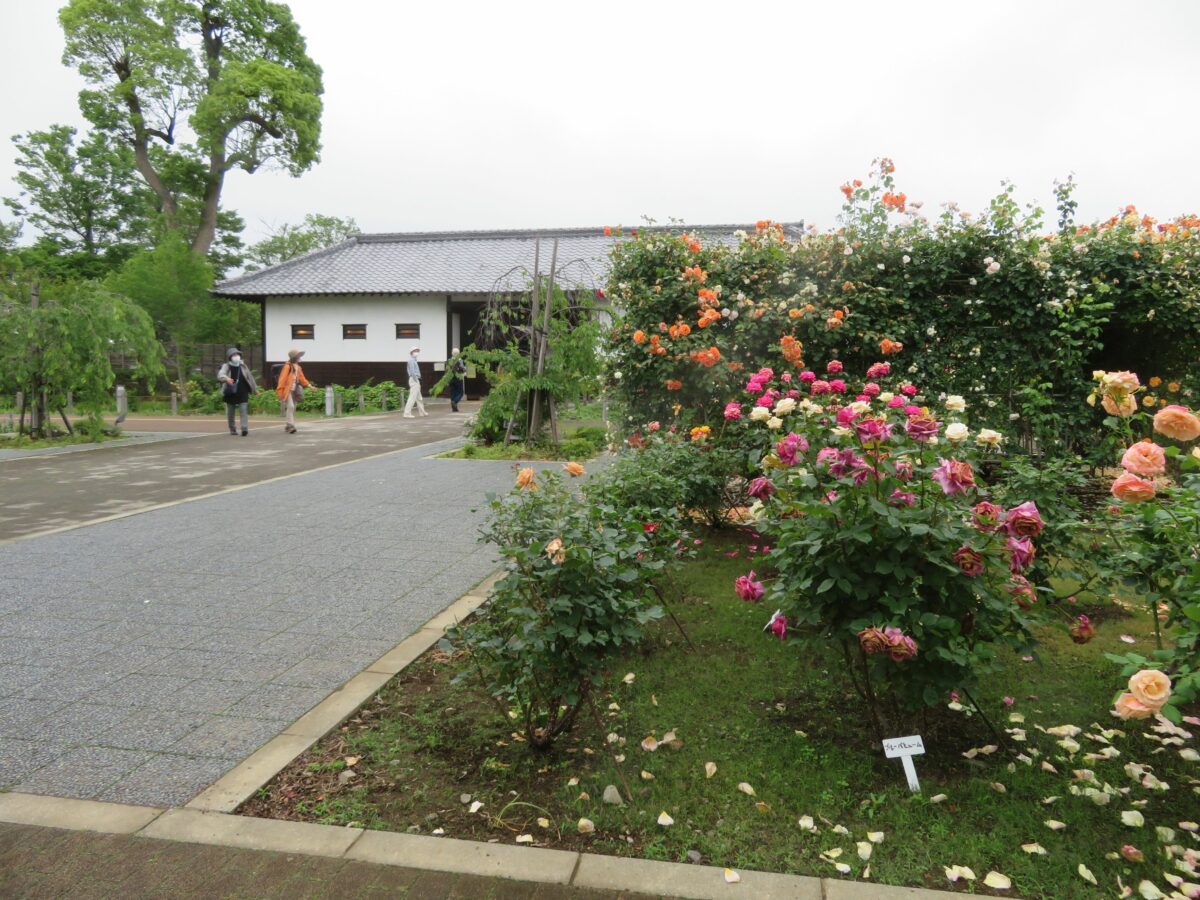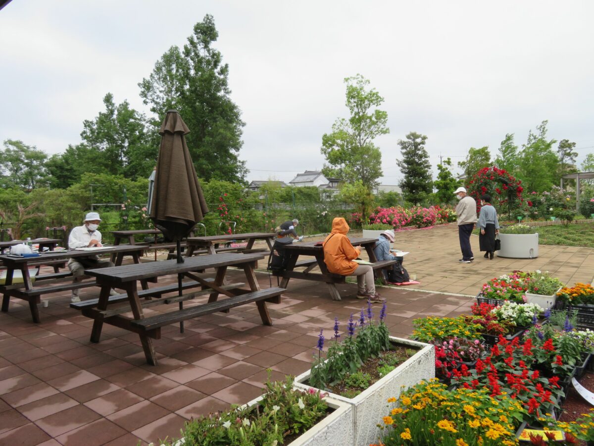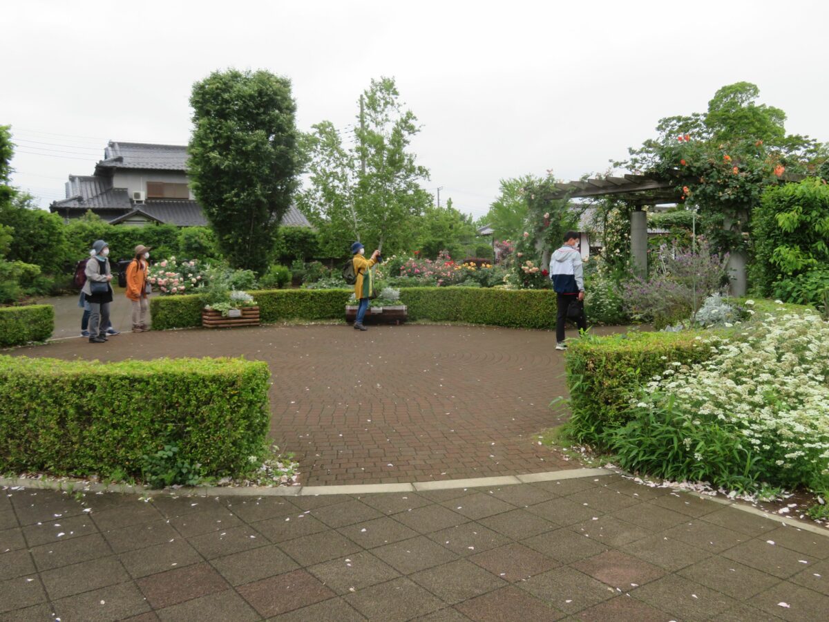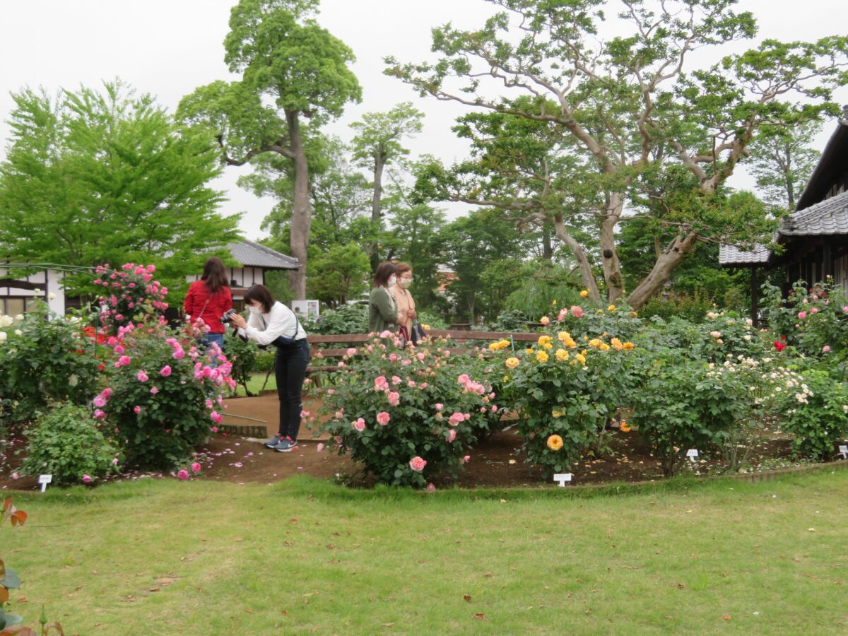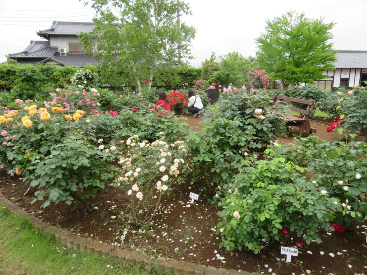 ローズガーデンに接するテラスでは、熱心に写生をする人々の姿を見かけることができます。長屋門の外や駐車場もバラで包まれ、「花久の里バラまつり」の期間中は、敷地全体にバラの彩りが溢れます。