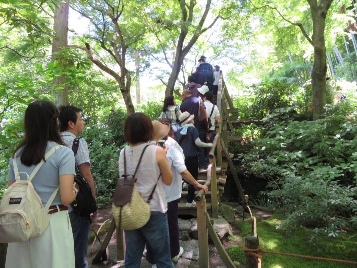 月笑軒の南に架かる桂橋を渡ると中庭園です。園内は「明月院ブルー」と賞されるヒメアジサイの淡い青色の花で包まれます。足元から頭の上までが、「明月院ブルー」で覆われる花園です。