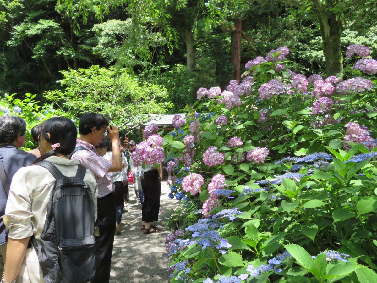神奈川県鎌倉市には、1192年に日本初の武家による幕府が開かれました。南は海に面し、その他の三方は山に囲まれる地形が、天然の要塞となっていたのです。現在ではこの地形の特徴が数多くの景勝地を作り上げ、観光地となっています。一年を通して多くの観光客が訪れていますが、市内の各所であじさいが花を咲かせる梅雨のシーズンは、市全域を会場として「あじさいまつり」を開催しているかのようです。