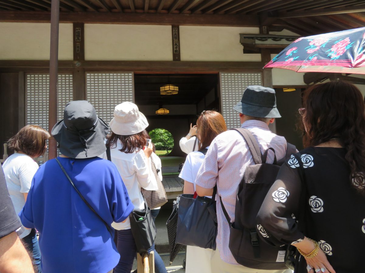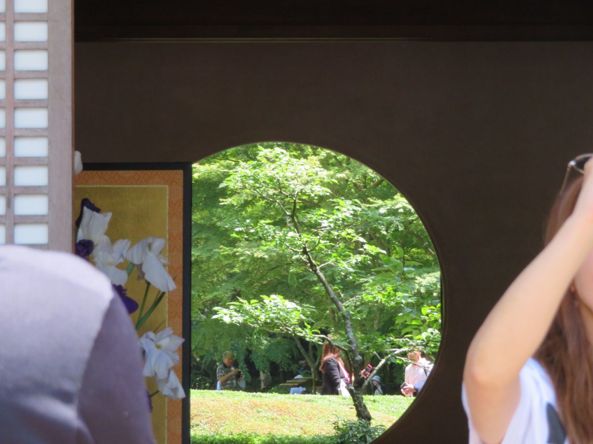 中庭園の南に接して、本尊の聖観音菩薩坐像を祀る方丈が建造されています。方丈に設けられた円窓は、悟りや真理、大宇宙などが象徴的に表現され、「悟りの窓」と呼ばれています。「悟りの窓」の先には後庭園が広がり、あじさいの他ハナショウブが季節の彩りをつけています。