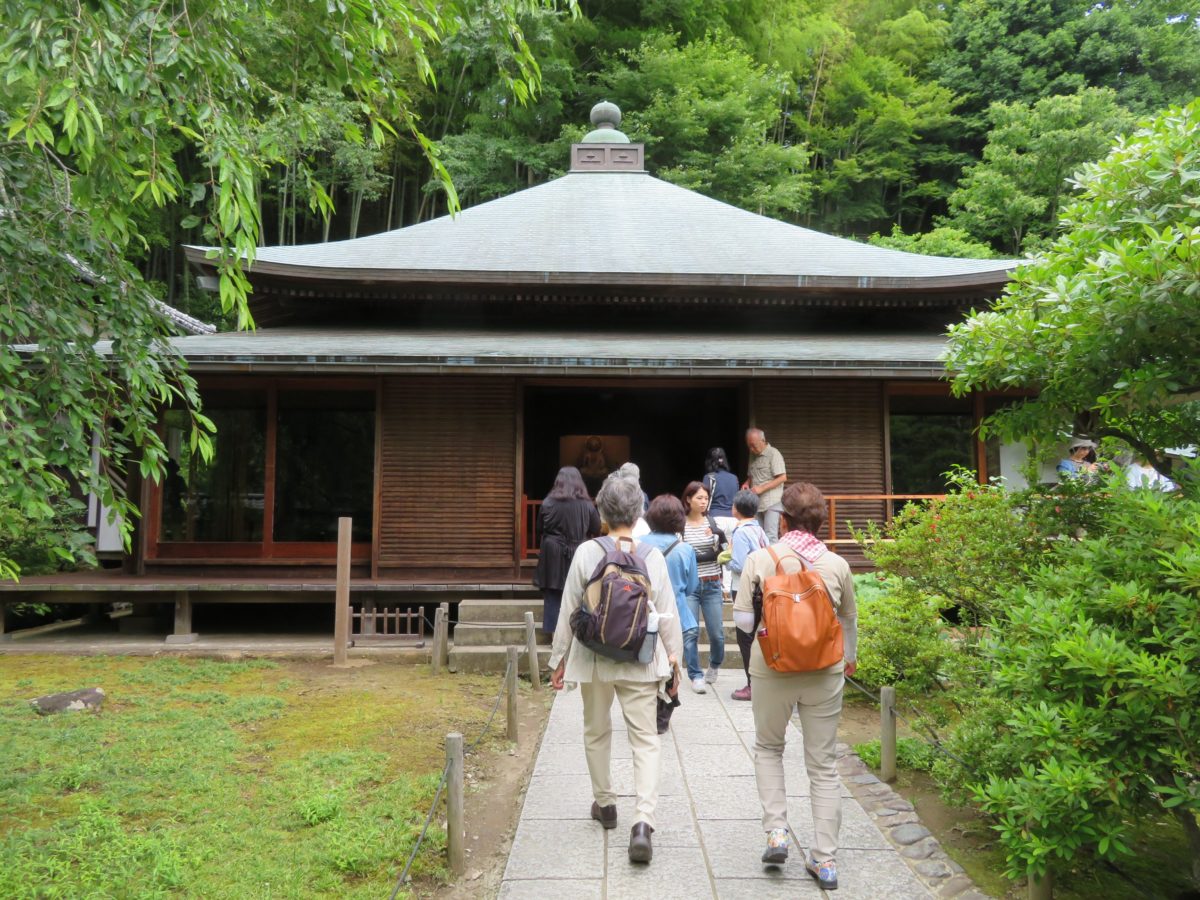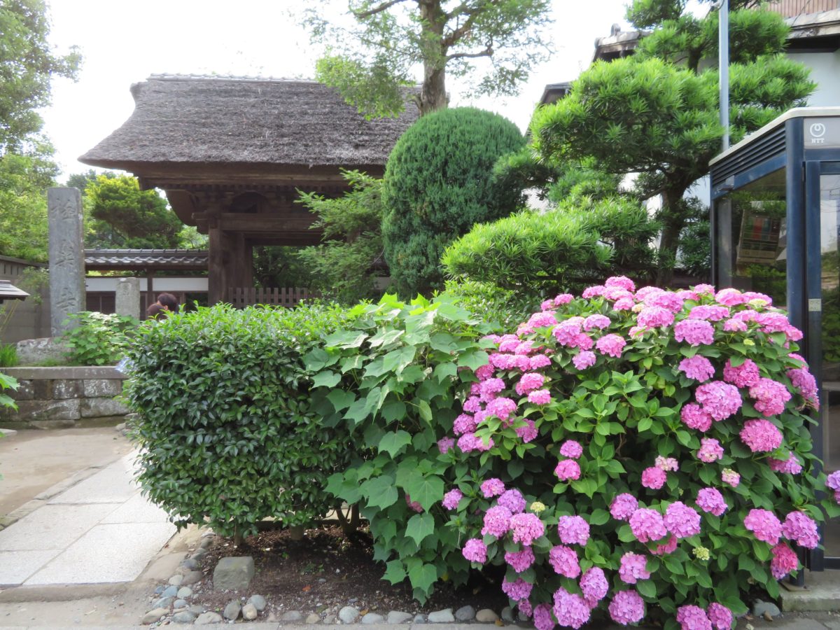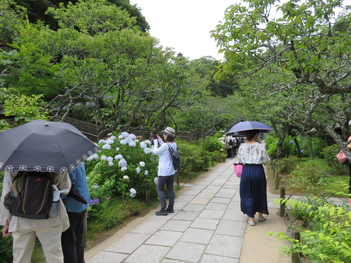 明月院から西に約500メートルの東慶寺は花の寺として知られ、梅雨の時期にはあじさいの花で彩られます。北条時宗の子、貞時を開基として1285年に開創された臨済宗円覚寺派の寺院です。玄関の山門からあじさいの道が始まります。境内には石畳の道が繋がり左右からあじさいの花が忍び寄ってくるようです。