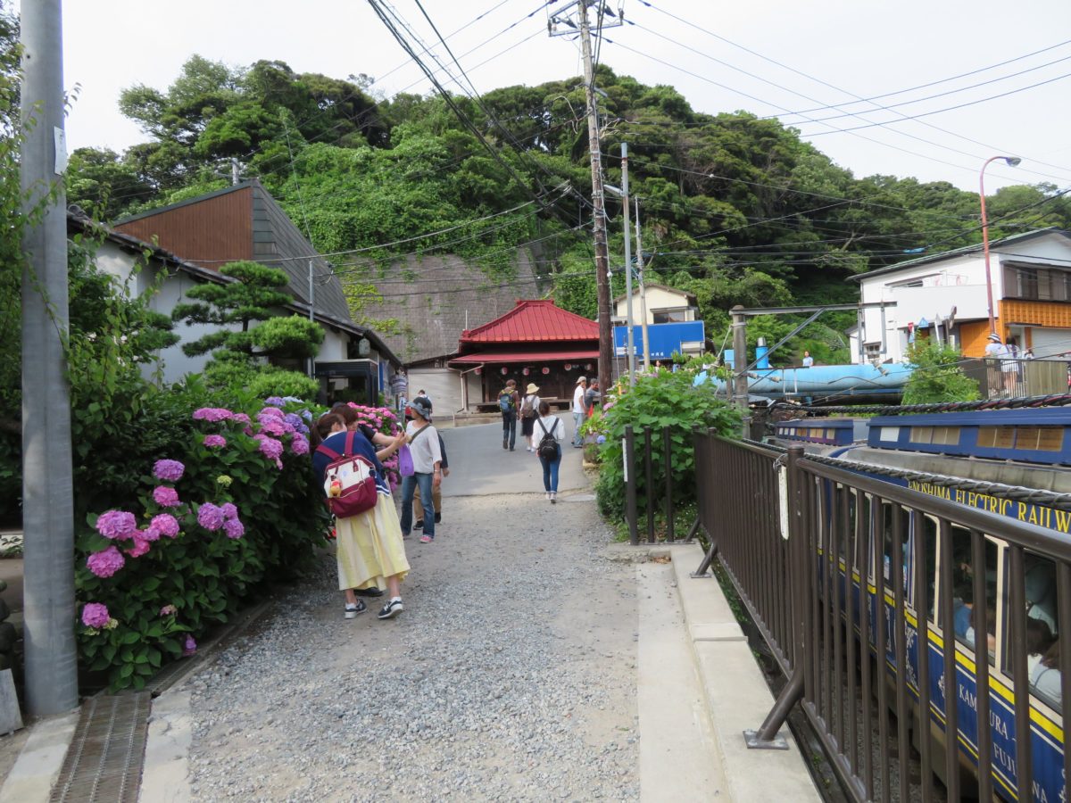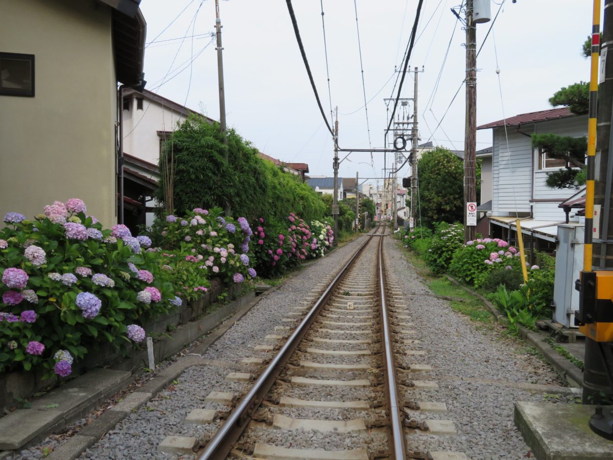 御霊神社に接する江ノ電の線路を左右から挟み込むあじさいの花