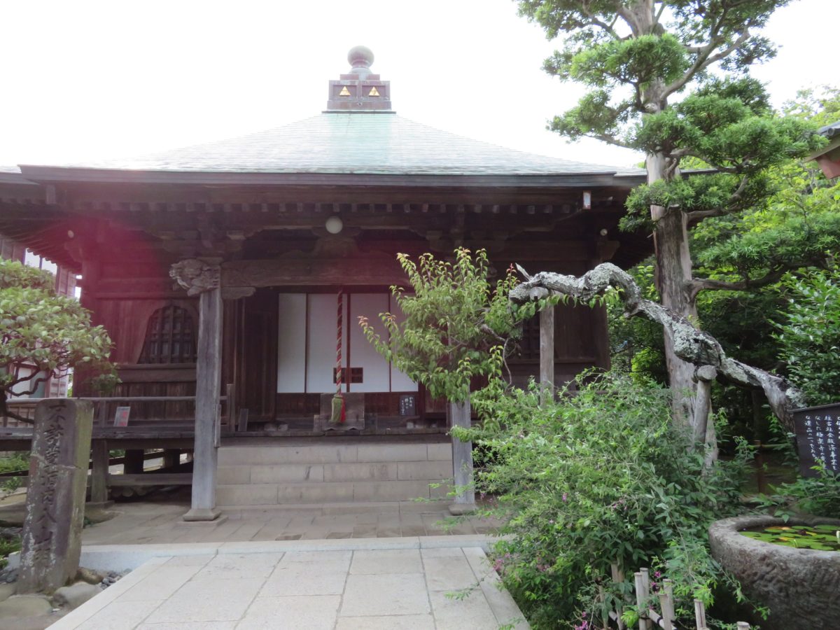 寺院の本尊の釈迦如来坐像を祀る本堂は、宝形造の特徴的な屋根で装飾されています。堂の裏側は、イワガラミの花が彩りをつけています。