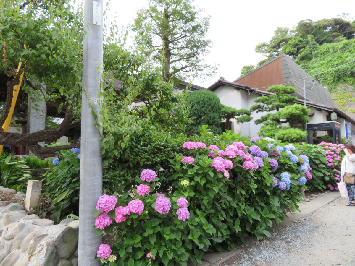 江ノ電の極楽寺駅から徒歩約2分の極楽寺は、鎌倉では唯一つの真言律宗の寺院です。鎌倉幕府弟2代執権の北条義時の三男重時が1259年に建立したと伝わります。江ノ電の線路に接するように建つ山門の両側から、あじさいの花が訪れた人々に季節の彩りをつけて語りかけてきます。