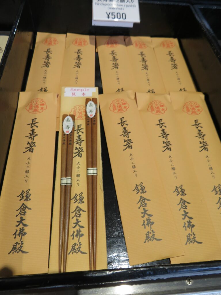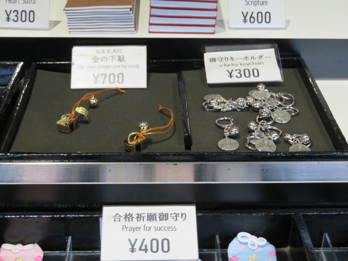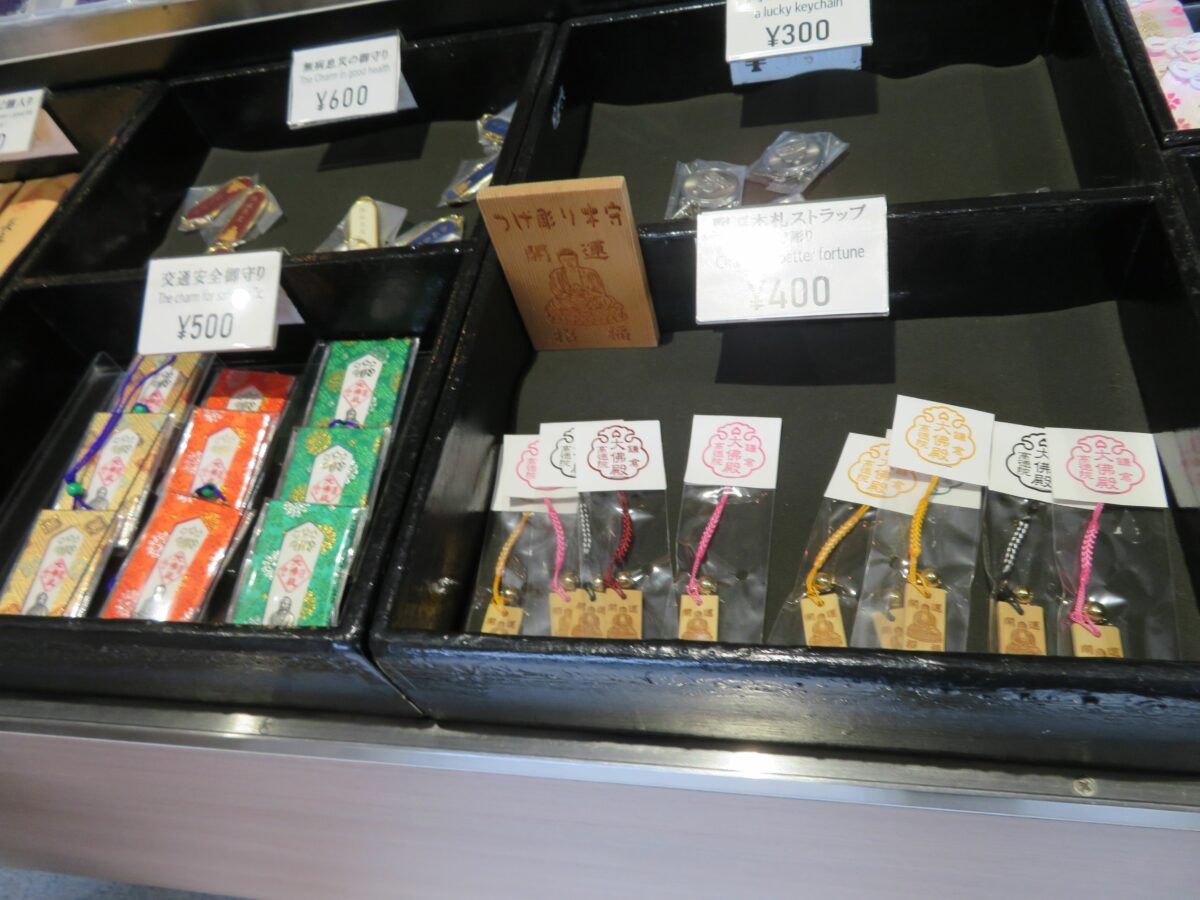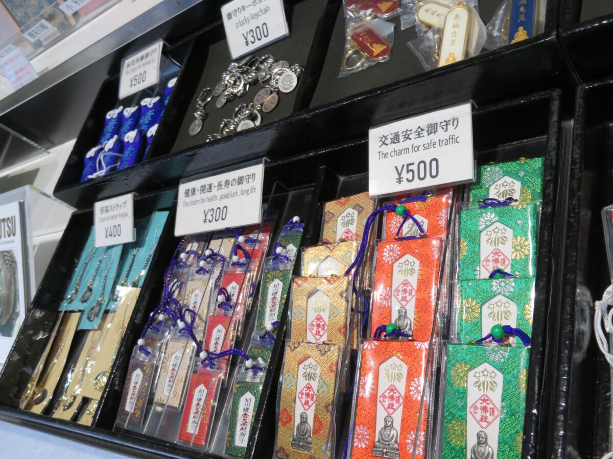 寺務所に並ぶお守りの種類も豊富ですが、大仏像の「招福ストラップ」、柘植の木に大仏の姿が刻印された「つげ彫り開運招福ストラップ」、大仏の影像が彫り込まれた円形メダルの「御守りキーホルダー」は携帯に便利でしょう。「金の下駄」には足を丈夫にするご利益が期待できそうです。「長寿箸」には縁結びのパワーが漲っています。