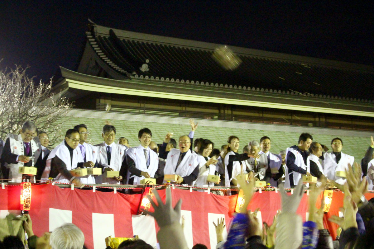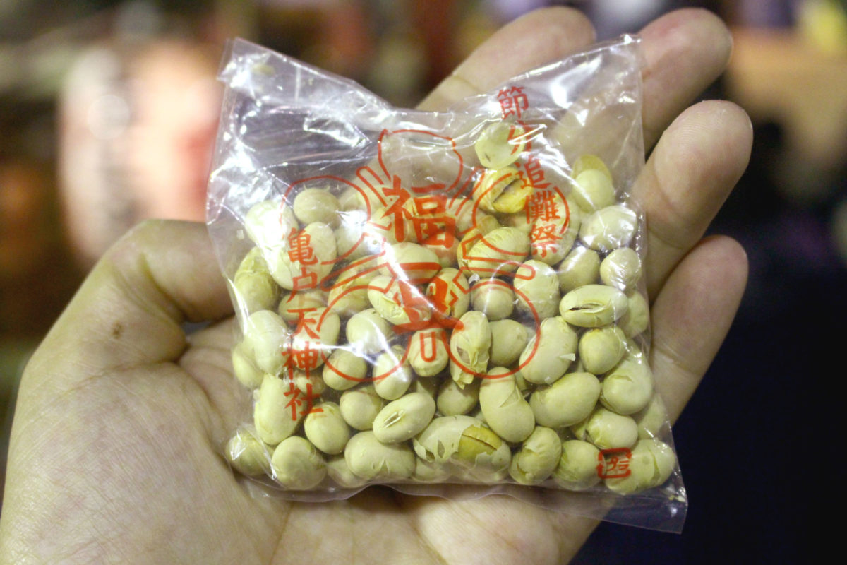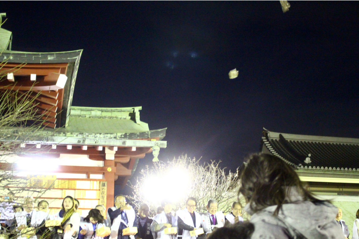 けっこう勢いよく、四方八方から豆が飛んできます!豆のご利益を求める参拝客で、境内はかなり賑わっています!