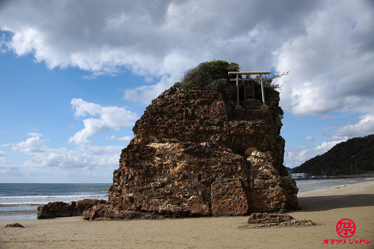 この稲佐の浜では近年、砂浜が広がったため歩いて行けるようになった「弁天島」という小さな島があります。この弁天島には明治まで弁財天が祀られていましたが、現在は豊玉毘古命(とよたまひこのみこと)が祀られています。