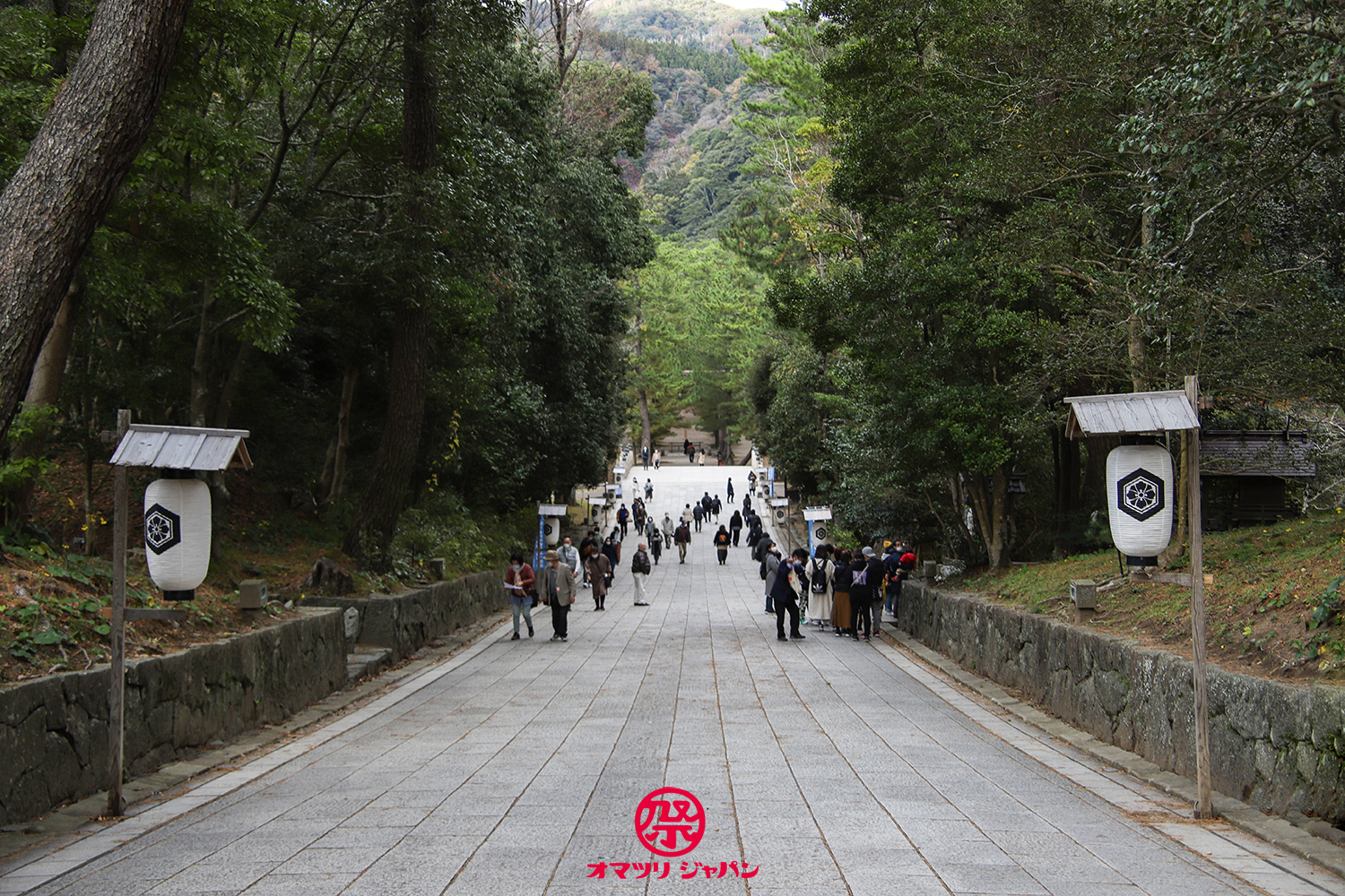 次は樹齢400年と言われている松の参道。昔はこの中央の道は神様や天皇陛下など、身分の高い方だけが通ることが許されていました。現在は松を保護するためという看板がかかった足止めが置いてあります。