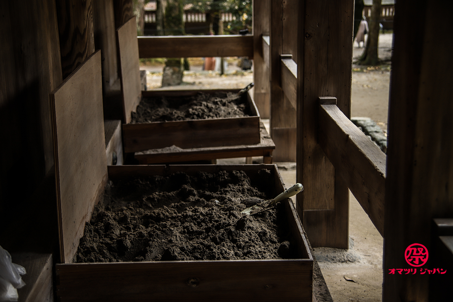 そして、この素鵞社にある砂は家や土地を守るご利益があり、稲佐の浜の砂をこの素鵞社にお納めし、床下にある砂を少しいただく、という手順が必要です。この砂を自宅などの土地の四方に巻くことで神様から守られます。