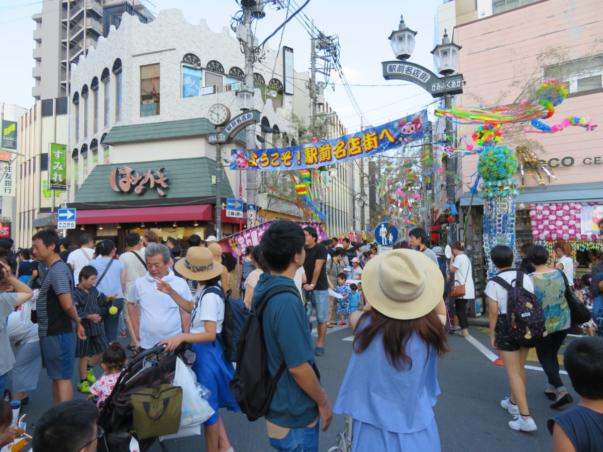 駅前名店街の反対側、駅前通りの北のエリアも一面、七夕の飾りでいっぱいです。八雲通り、一番街、上野台銀座ばかりでなく、細い路地までが七夕のムード一色。町が一体となって七夕まつりをつくり上げているんですね。
