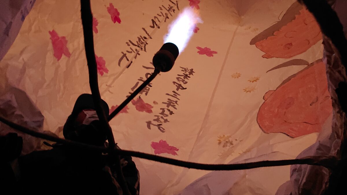 18時の一斉打ち上げの時間になると、大小さまざまな紙風船が一斉に放たれます。例年100個以上の風船が上げられ、冬の夜空を彩ります。