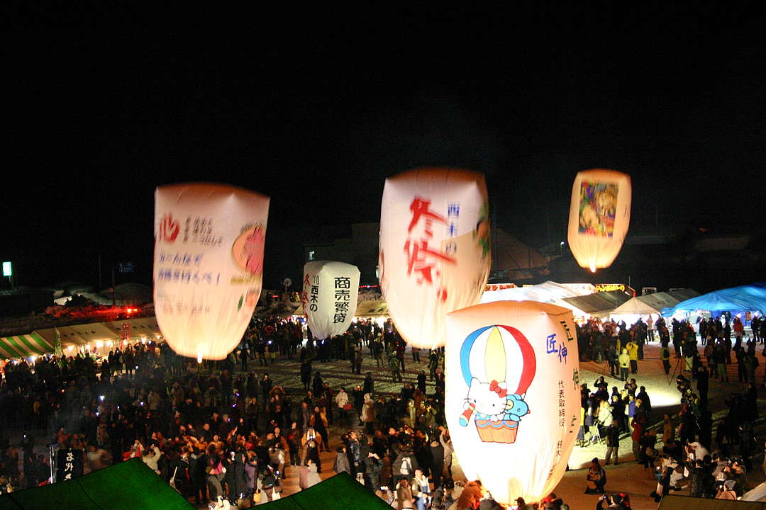 18時の一斉打ち上げの時間になると、大小さまざまな紙風船が一斉に放たれます。例年100個以上の風船が上げられ、冬の夜空を彩ります。