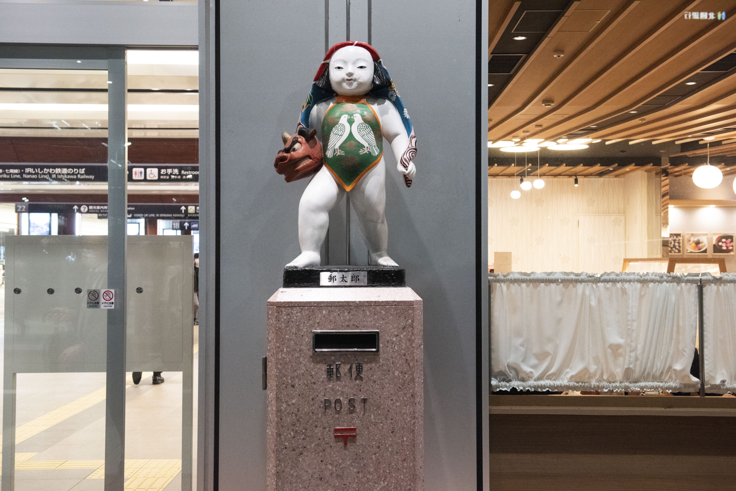 さて、今回の取材の合間に金沢の街を歩き回ってみると、獅子頭を持った少年が郵便ポストの上に立っているのを発見!1954年の金沢駅舎が完成して以来、ここに立ち行き交う人を眺めている加賀人形だ。名前は「郵太郎」と名付けられているらしい。公式webサイトも立ち上がっており、趣味は「獅子舞」と書かれている。