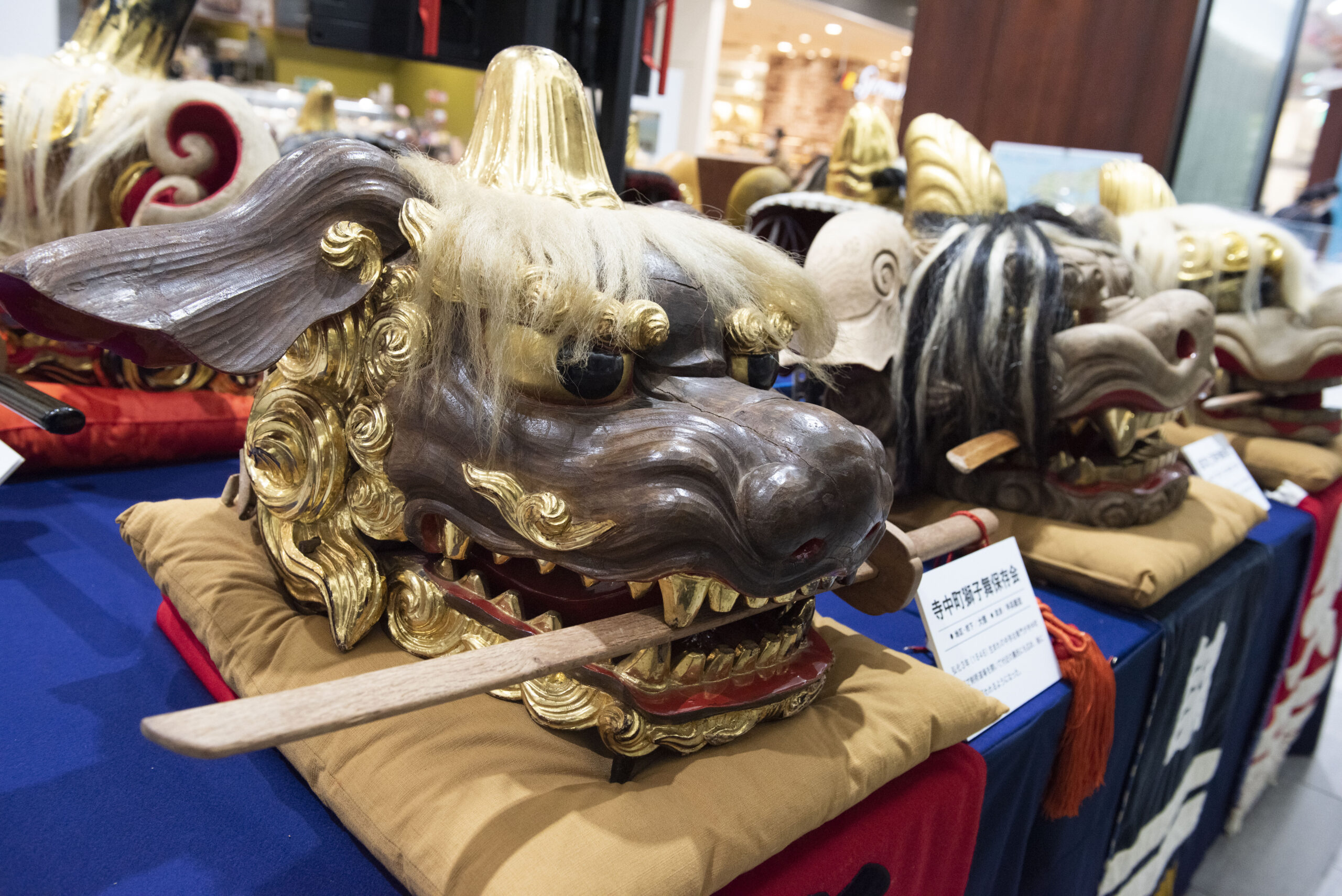 さて、この金沢百番街の一角に設けられたのが、この「加賀獅子頭展示会」のブースだ。大きな提灯が目印となっており、ずらりと獅子頭が並んでいる。