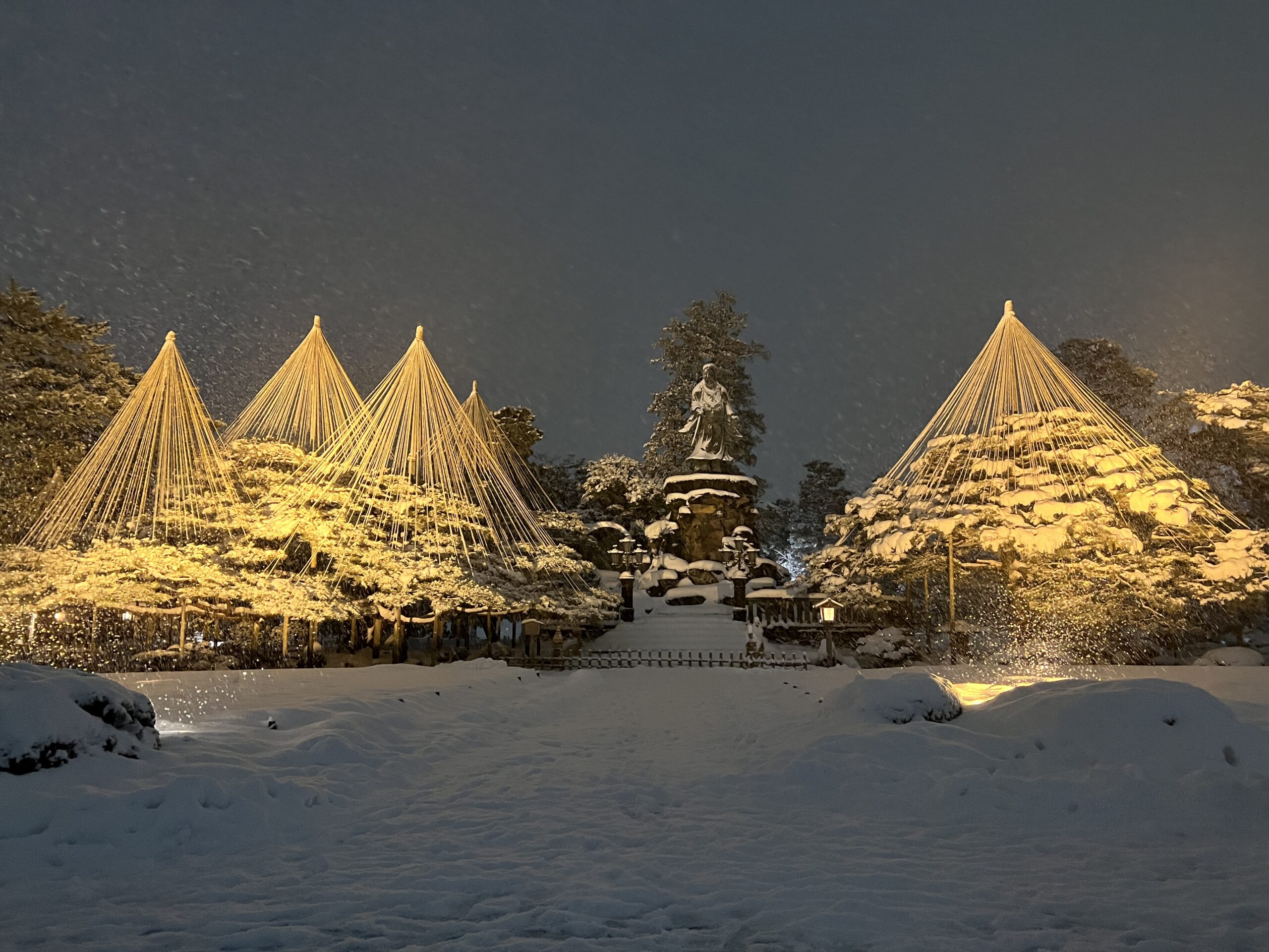 雪景色の中に金色の雪吊りが輝く眺めはまさに金沢の冬の絶景!その様子をレポートします。