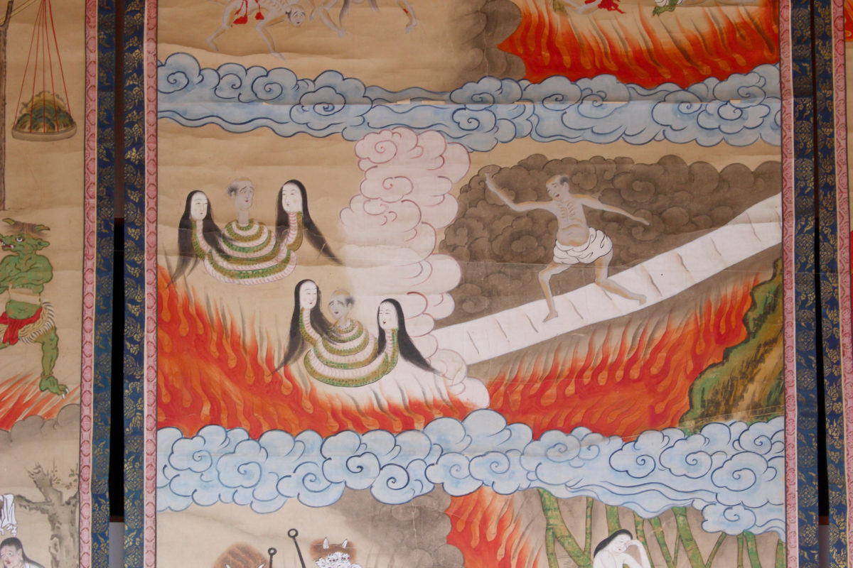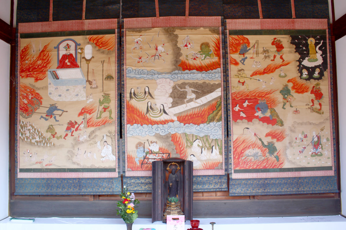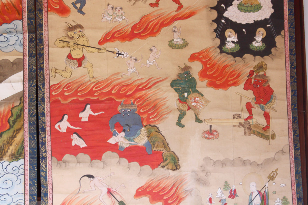 続いて、隣のお堂では地獄絵図をご開帳してました。物々しい絵です。