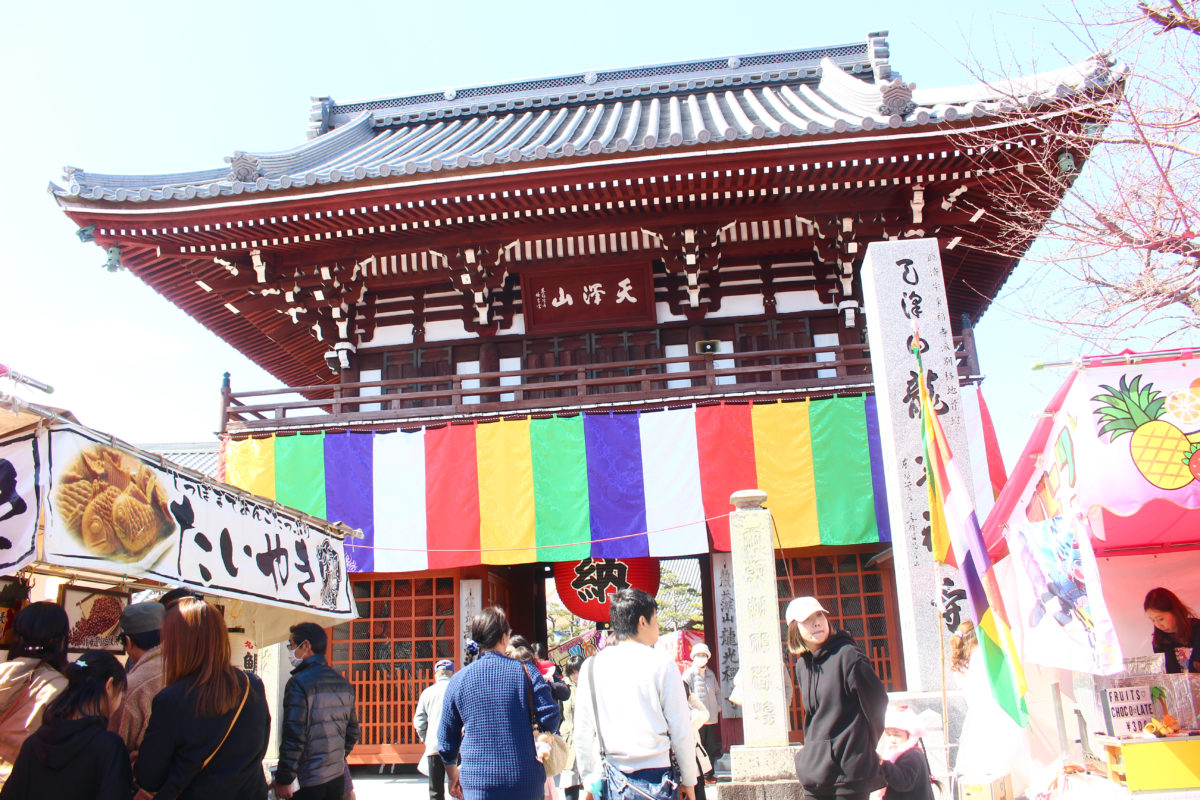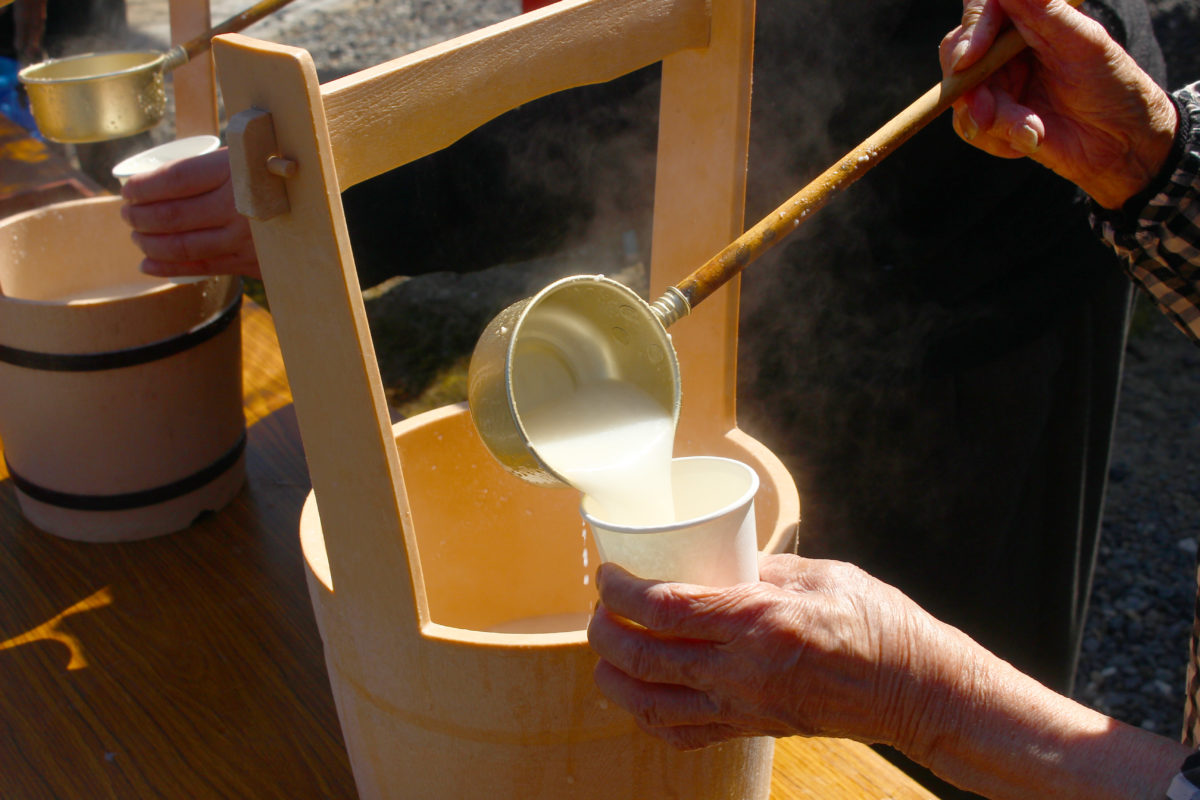 本堂が見えてきました!前では甘酒の振舞が行われています。思い思いに寄付をして、甘酒をいただくスタイルのようです。飲んでみると、酒粕で作られたおいしい甘酒でした!
