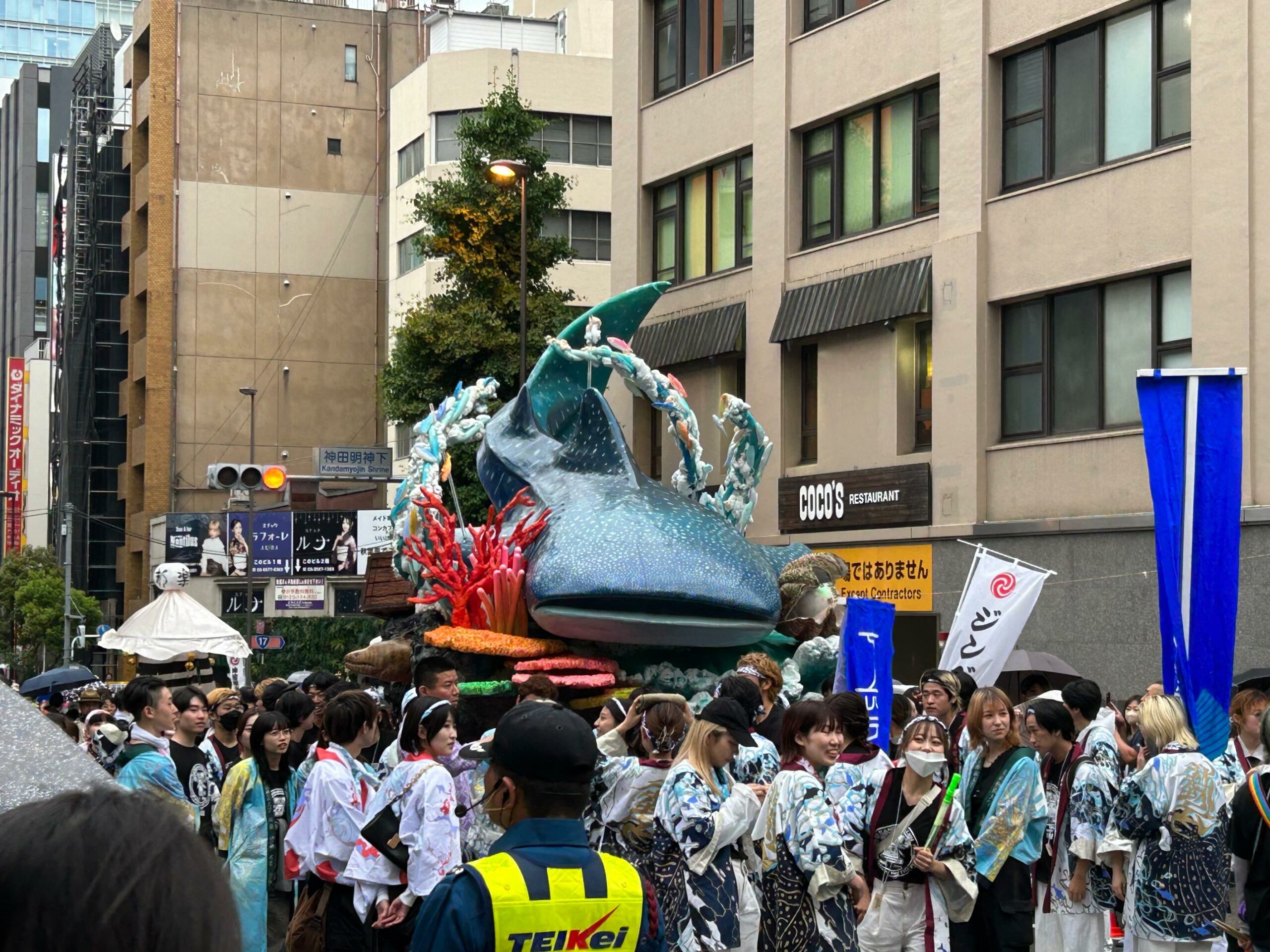 思わず二度見してしまうこの山車は、令和4年の東京藝術大学の藝祭で行われた御輿コンテストで明神賞を受賞した日本画・工芸・邦楽・楽理の学生たちによる曳き物「ジンベエザメ」です。