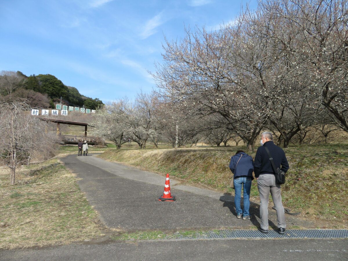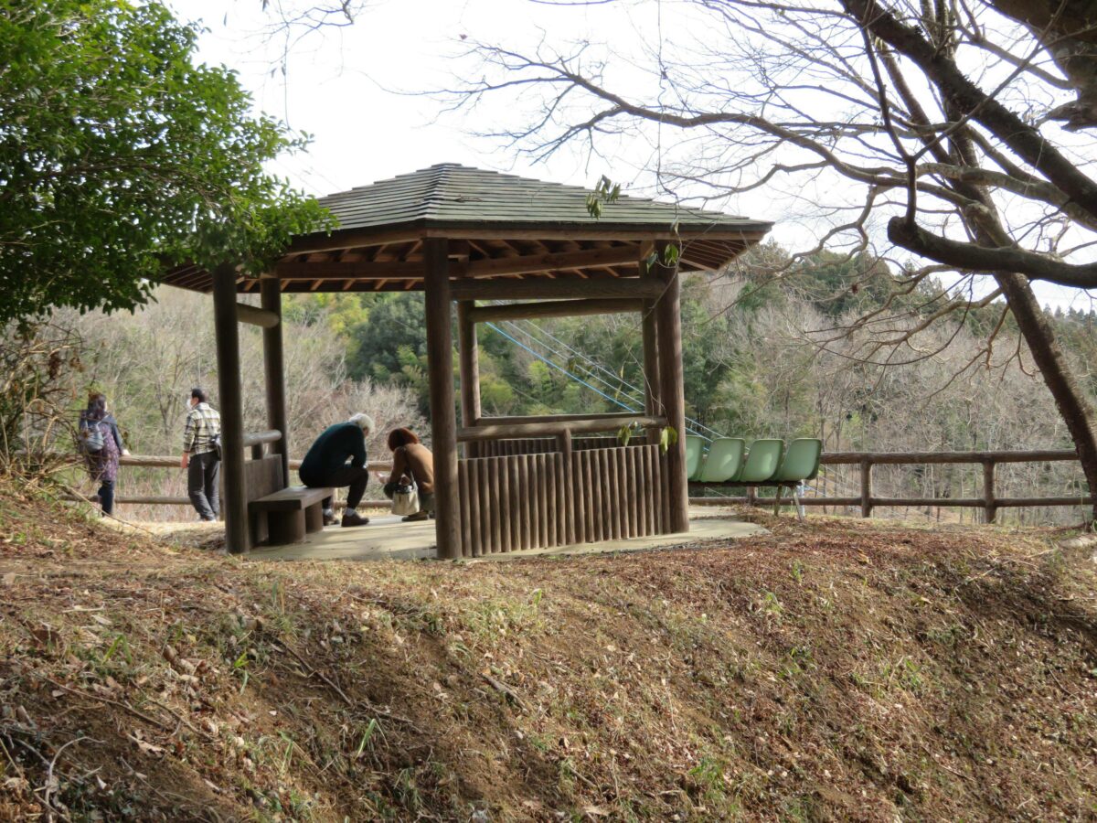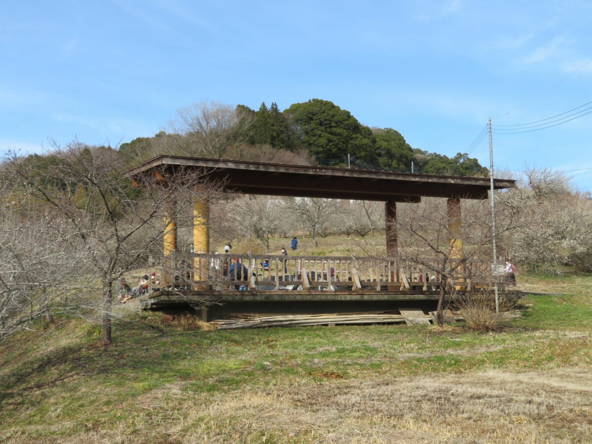 梅園内には、展望台や四阿が設けられ、眼下には梅林や市貝町の里山が広がります。