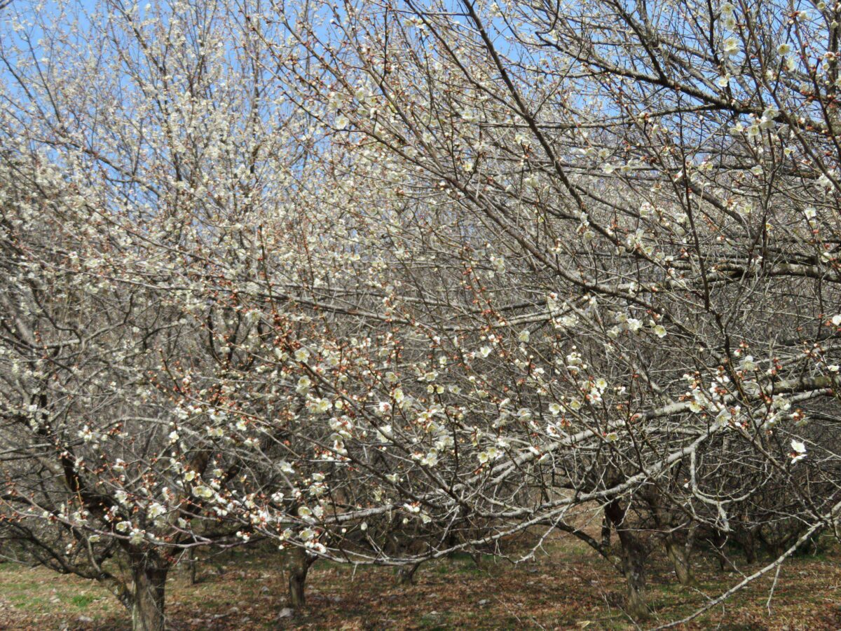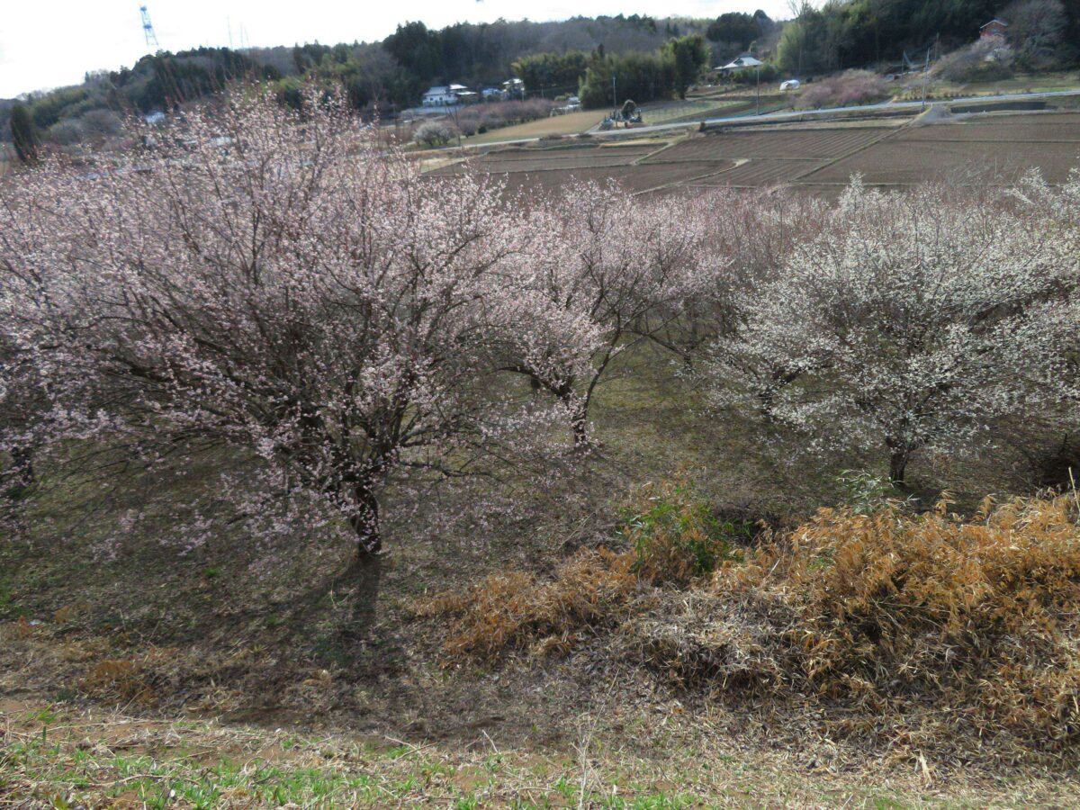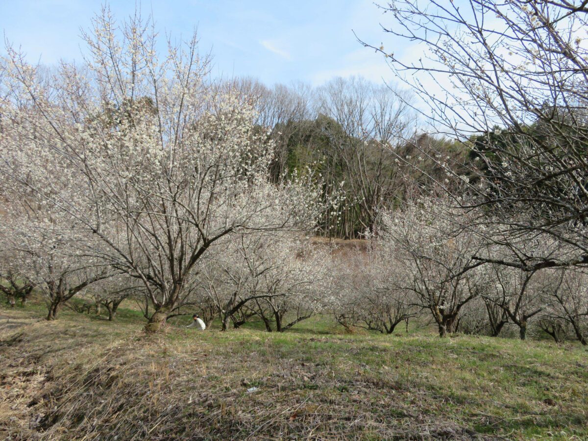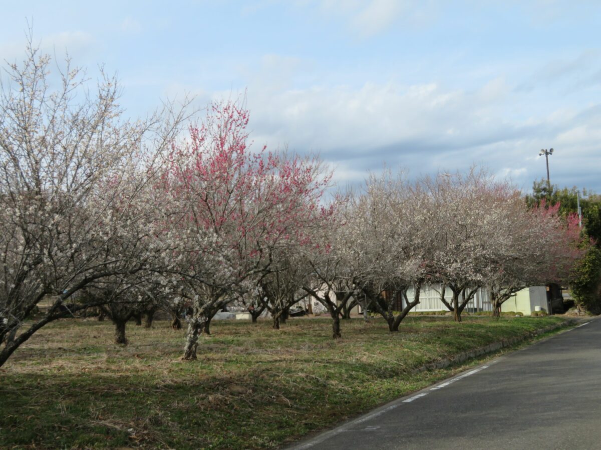 観音山の梅園は白梅が真白に彩っていますが、麓の農産物加工所を囲む梅林では、紅梅と白梅がバランスよく溶け合っています。