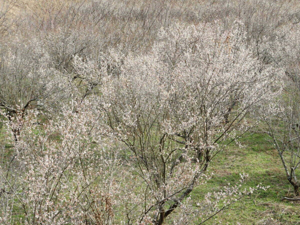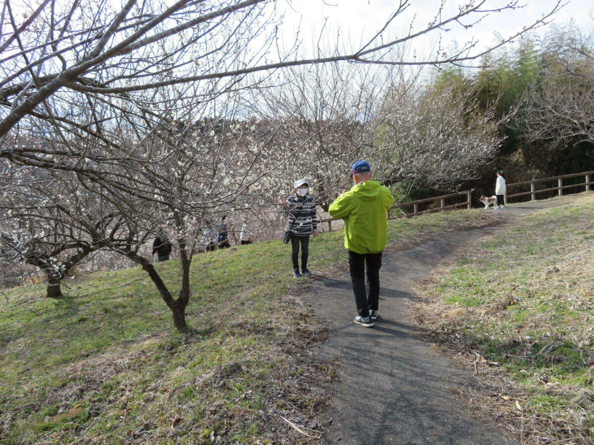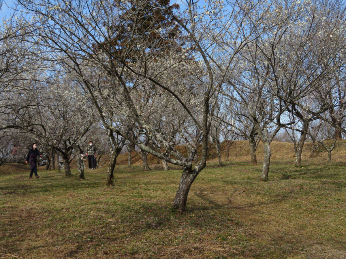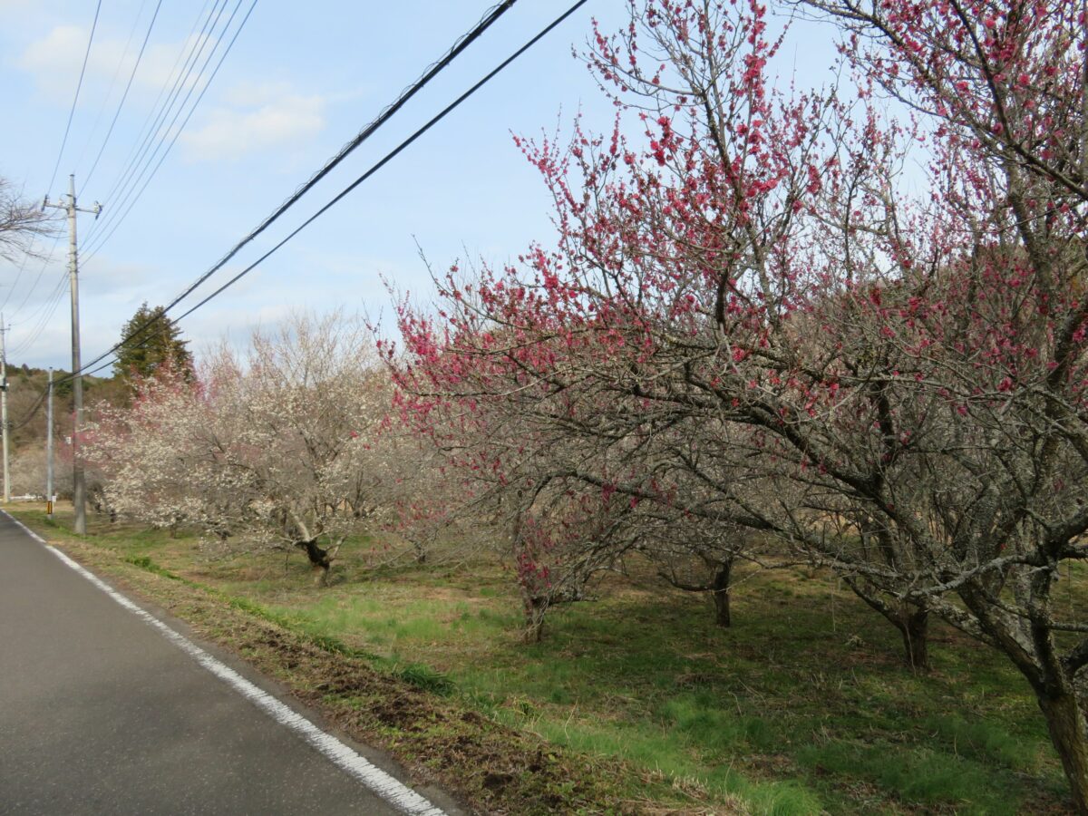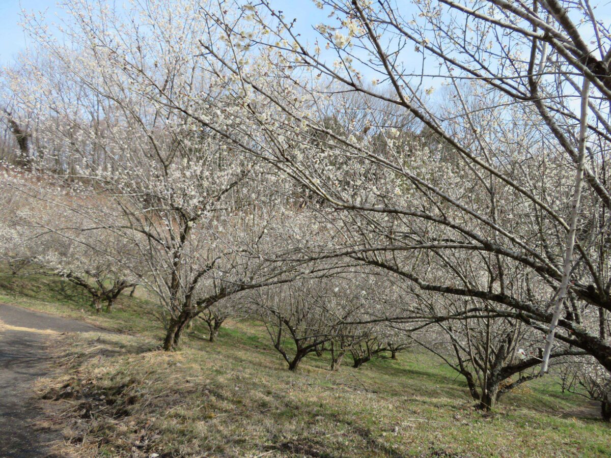 観音山の梅園は白梅が真白に彩っていますが、麓の農産物加工所を囲む梅林では、紅梅と白梅がバランスよく溶け合っています。