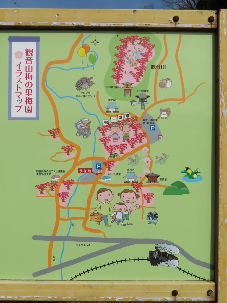 現在、梅園として整備されている観音山には、かつて村上城が建造されていました。1378年に村上新助良藤が築城し、その後3代にわたって村上氏が居城したと伝わります。当時の建造物は何も残っていませんが、山の中腹の千手観音堂が歴史感を漂わせています。