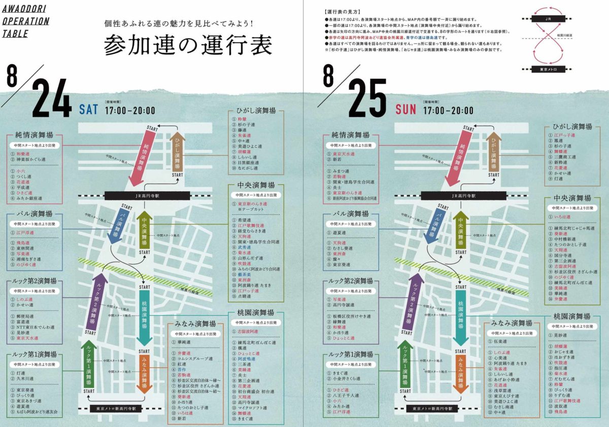 毎年初夏にはこのような運行表が発行される。130mから250mほどの8つの通りを演舞場とする。大体1日に回れるのは全演舞場のうち半分くらい。なので、見たい連がある場合は、必ずその連が通る場所で観覧することをお勧めします。