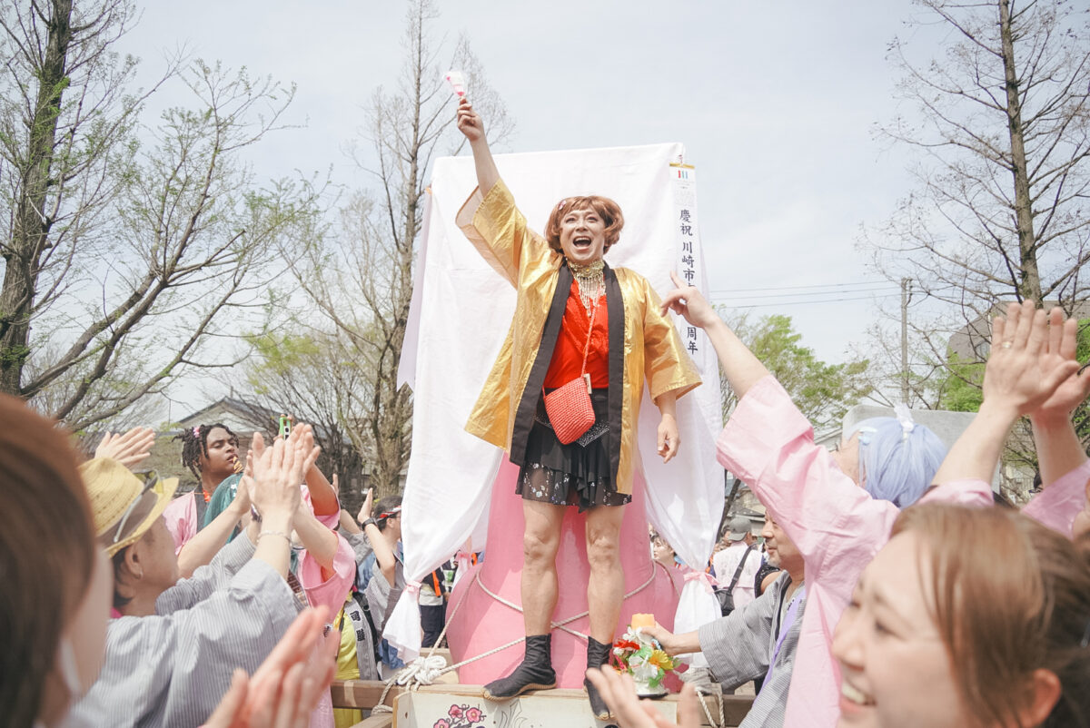 川崎大師商店街の入口を抜けて、開けた交差点ではエリザベス神輿を高らかに持ち上げる大技を披露。雄々しい縦ゆれの躍動に、会場のボルテージは最高潮に達した。
