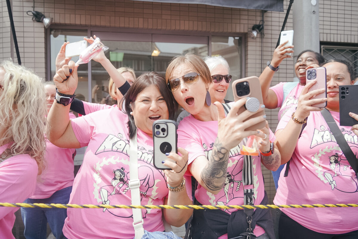 ほら、しっかりロープが張られているでしょ。てか、改めておそろいのピンクのTシャツを着て詰めかける人々の熱気が凄過ぎる。もうノリノリ。サッカー・スタジアムかよっ!
