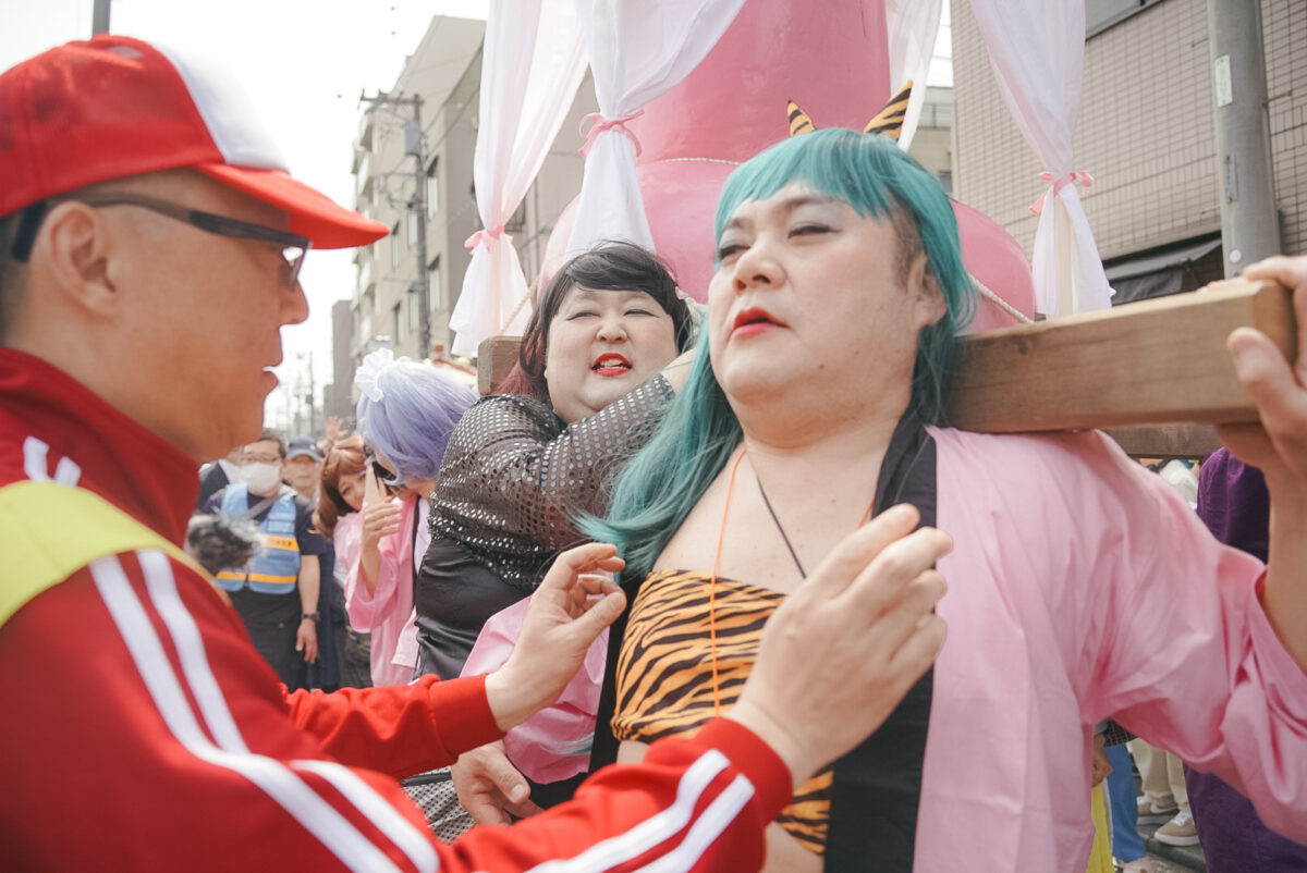 エリザベス神輿のかけ声は「でっかいまーら、かなまら!」という独特なもの。沿道の人たちに呼びかけ、盛り上げる様子をお守り隊が和やかに見守る。何ともピースフルな光景だ。