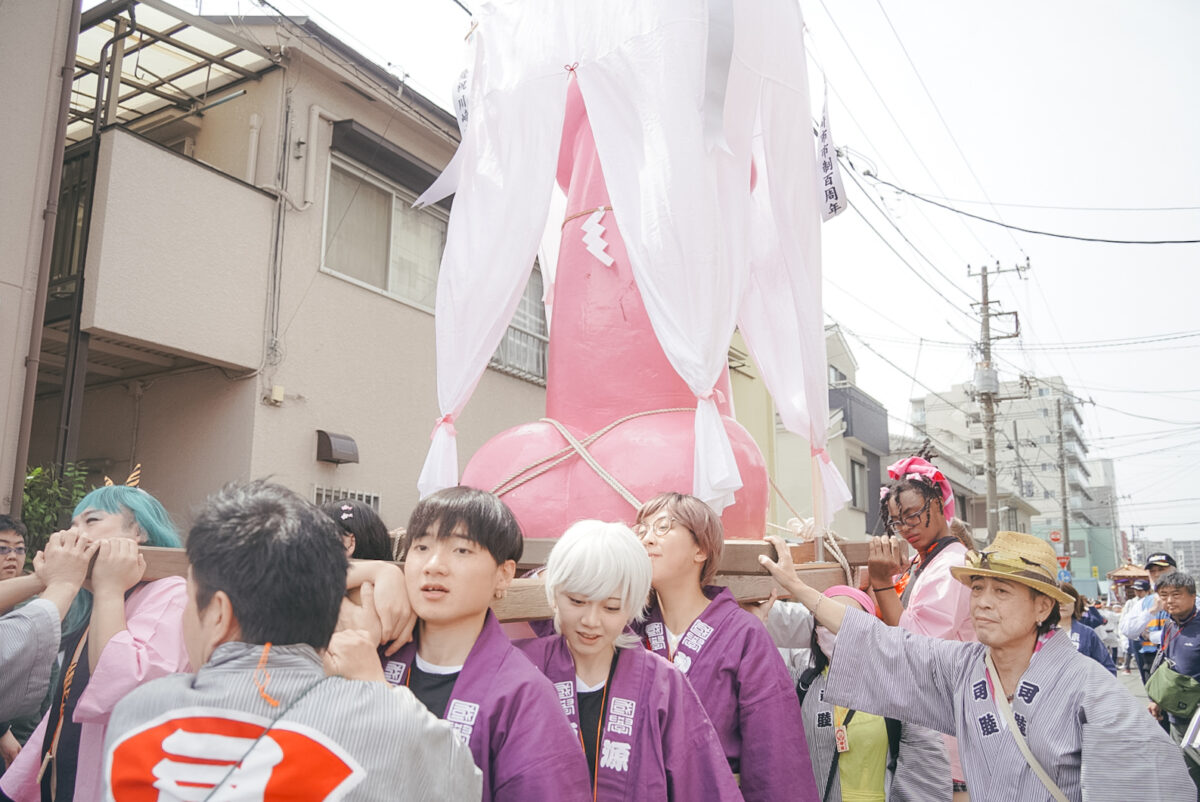 そして翌年の1988年、WHO(世界保健機構)が、エイズの僕滅と偏見や差別解消のために「世界エイズデー」を提唱。この時、かなまら祭のご利益の現代的な解釈として「エイズ除け」が加わった。この流れで1989年エリザベス会館の会員がかつぎ、エイズ除けを祈願する神輿として作られたのがエリザベス神輿なのだ。だからエリザベス神輿の担ぎ手が女装するのにはちゃんとした由来があるわけだ。