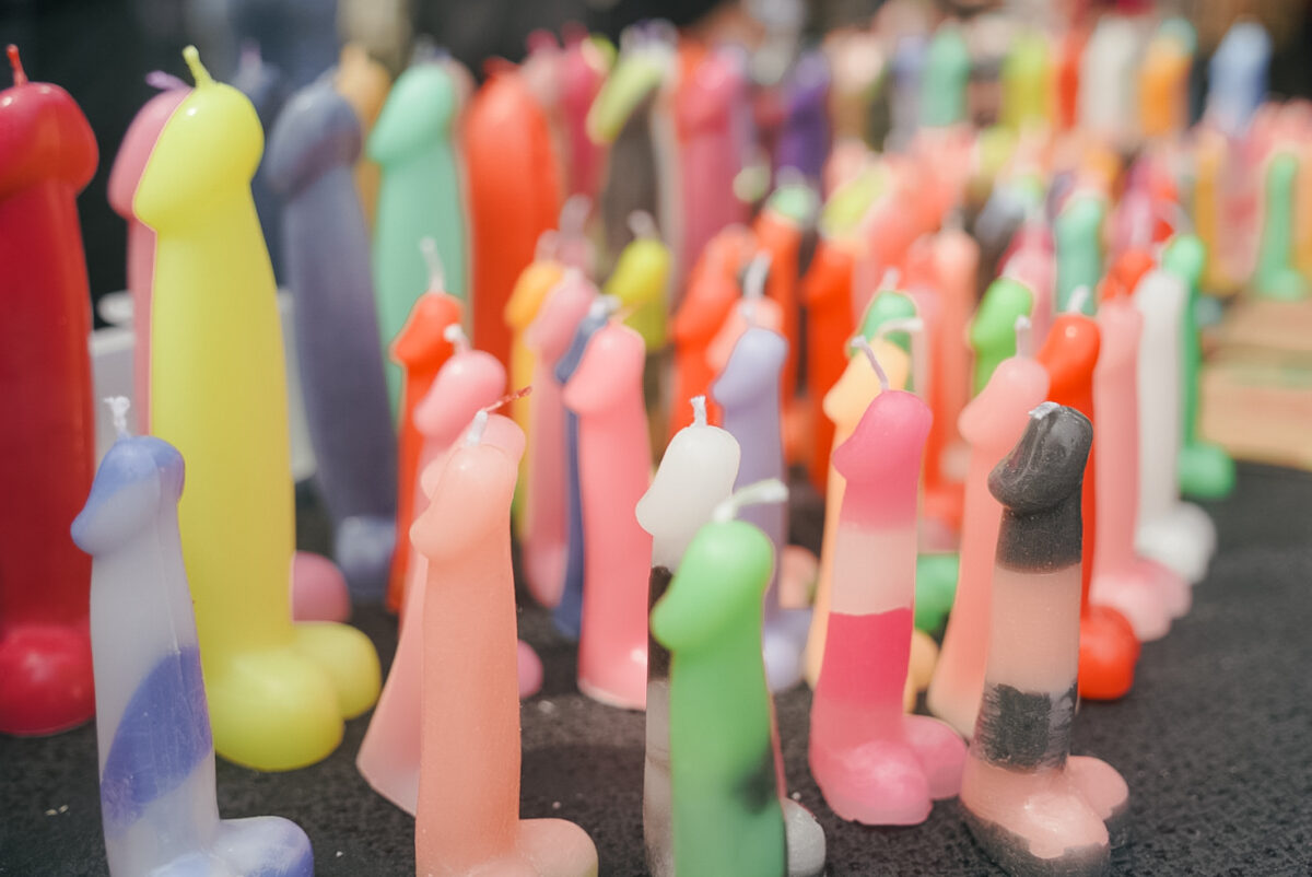 男根キャンドルを始め、境内では男根をモチーフにしたフードやグッズが所狭しと並び、独特の異様な雰囲気を作り上げている。