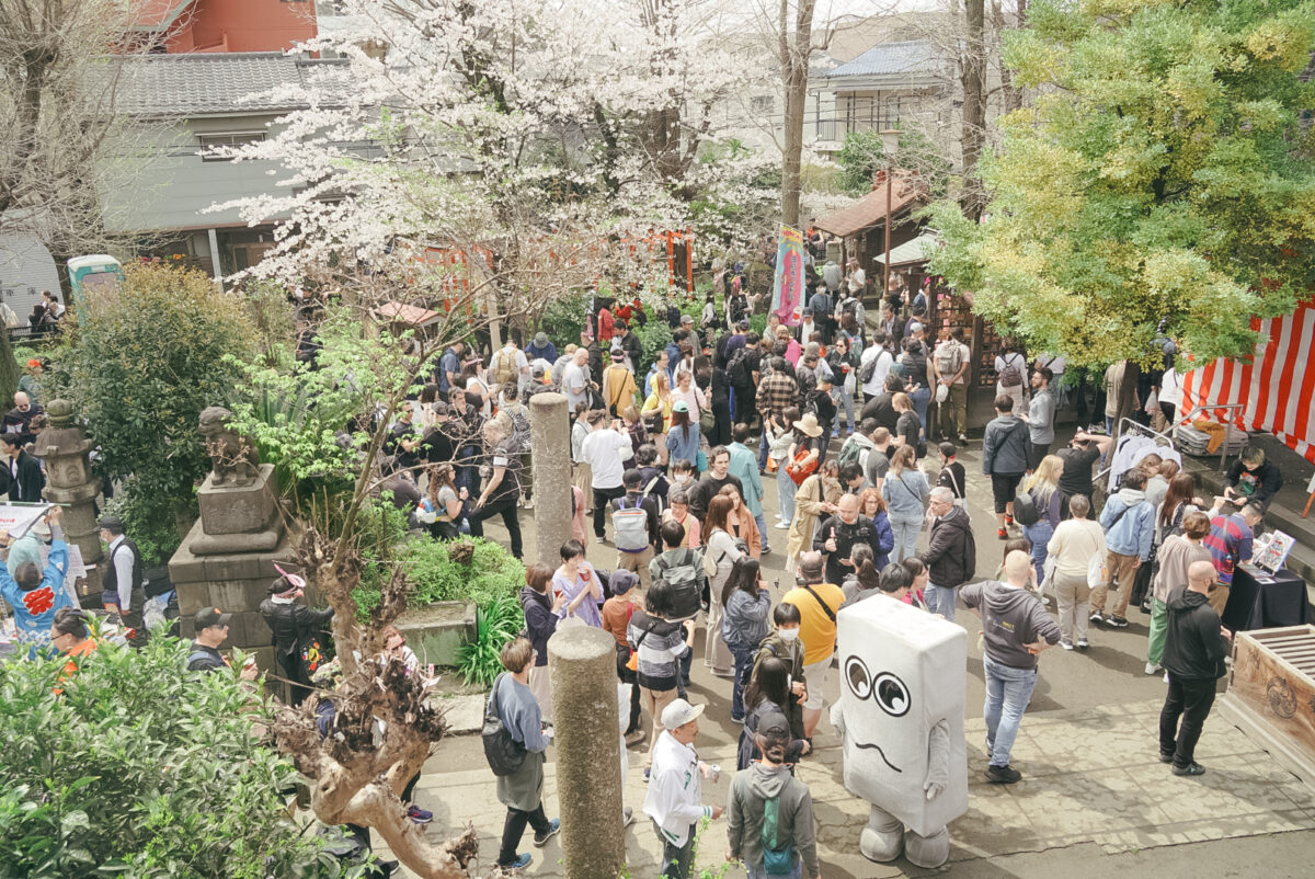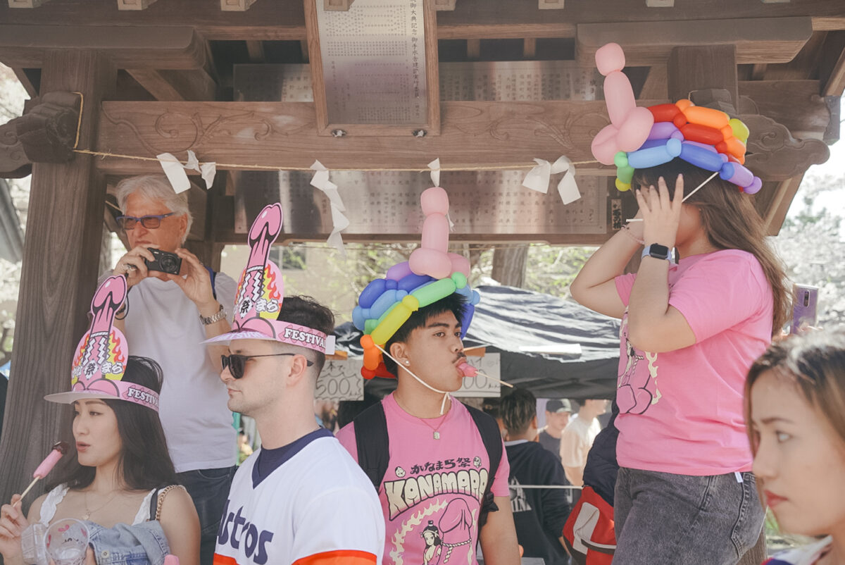 彼らが口にしているのが観光客に大人気の「子宝飴」。それにしてもシュールな光景だ。桜とアレで境内が真っピンクに染まる一日、それがかなまら祭。