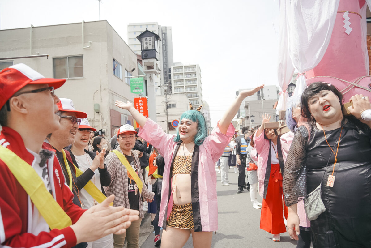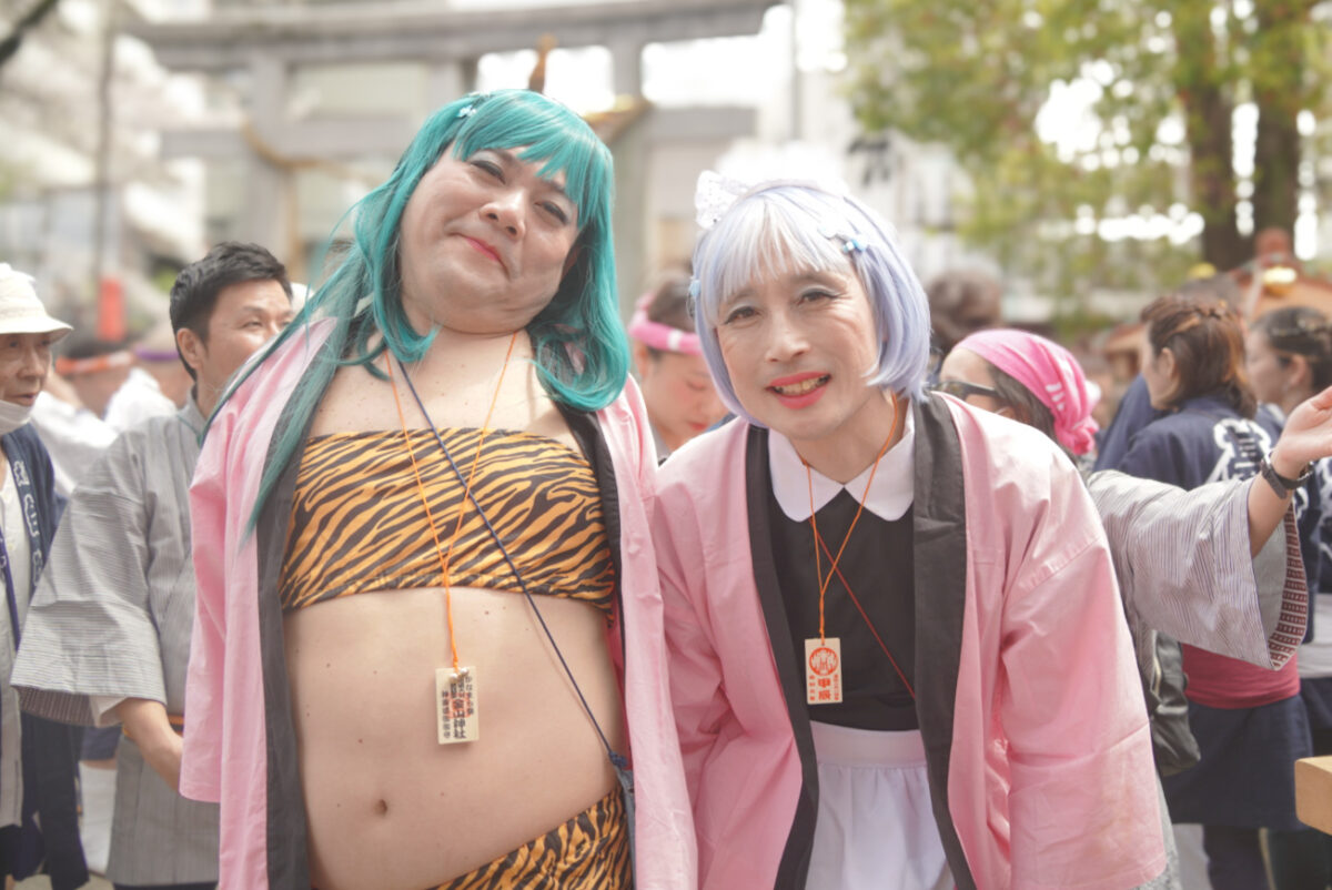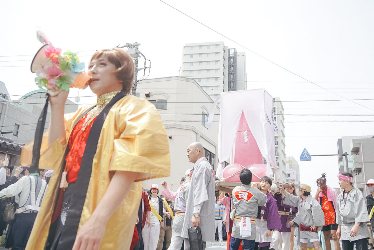 とは言え別に、酔狂で女装やコスプレしているわけではない。これにはれっきとした由来があるのだ。今ではすっかり「かなまら祭」のシンボルとなったエリザベス神輿だが、きっかけは1987年に神田(現在は浅草橋)の女装クラブ〈エリザベス会館〉のメンバーが手作り神輿を抱えて行列に参加したことに端を発する。
