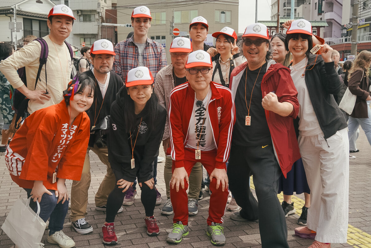 これが今回、物好きにもエリザベス神輿を守るために集まった10名の猛者たちだ。オイオイ、いい面構えをしてるじゃねぇか。中には首都圏タウン情報誌、月刊「散歩の達人」の名物編集長にしてYouTuberの全力編集長も紛れ込んでいやがった。いや編集長、もはや「散歩」の域を超えてませんか?