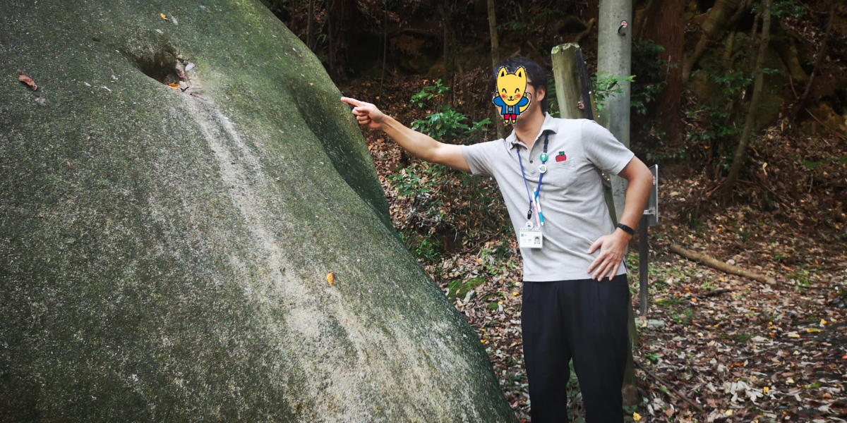 笠間の幸せスポット 大国石を紹介される 笠間市 観光課 Mさん。本人のご希望でお顔はいな吉