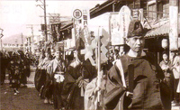 当日は、笠間藩弓馬訓練場跡である笠間小学校前から特設馬場までの約700mを、古式にのっとり行列を行います。馬場では、3ヶ所に設けられた高さ2mの的に、馬を走らせながら約20秒間に3本の鏑矢を射て、馬場中央にいる奉行所の日記役が、その命中度を記録し、割れ方によって来年の豊凶を占います。