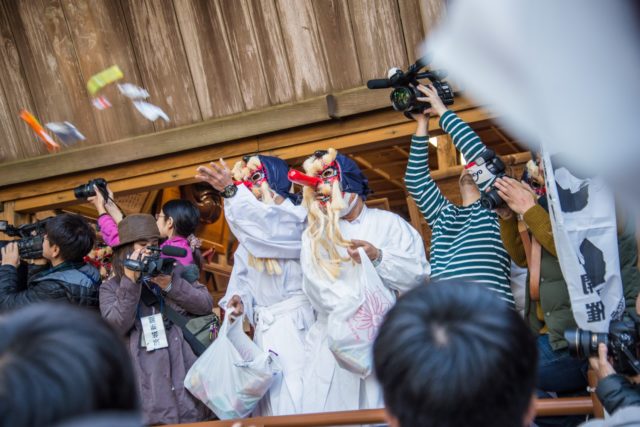 お菓子やお餅を投げまくる天狗