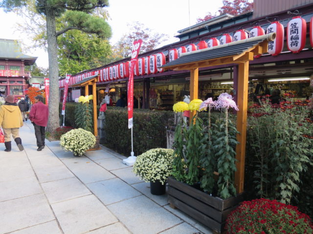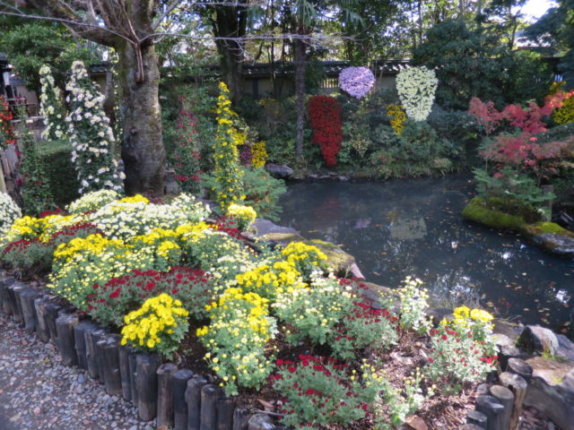 神社の前のお土産やさんや飲食店が立ち並ぶ「門前通り」にも菊の花が所々にあって、お散歩も楽しいです。